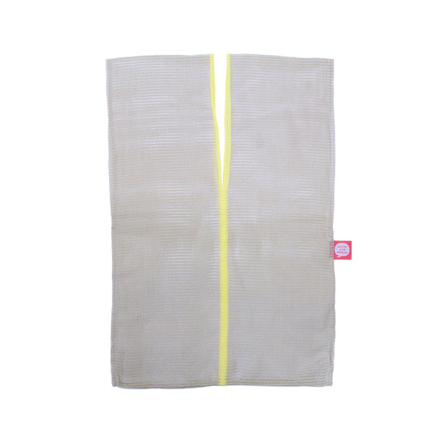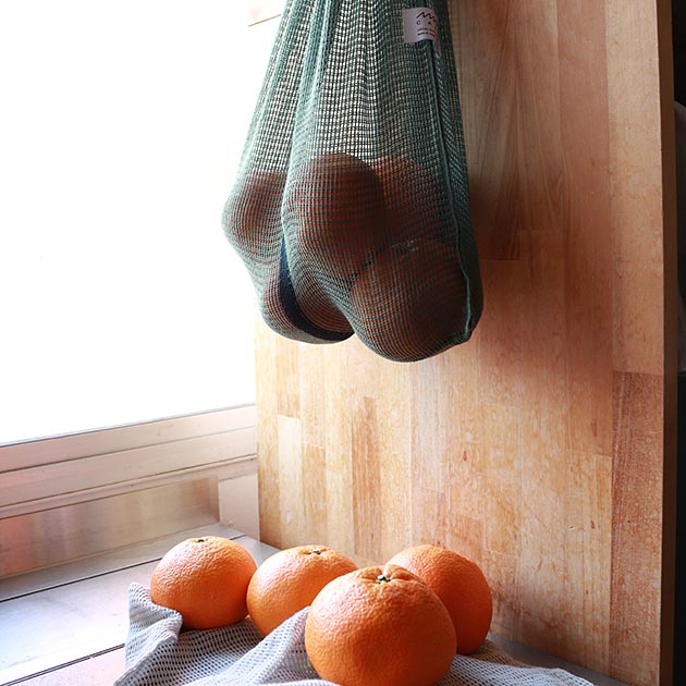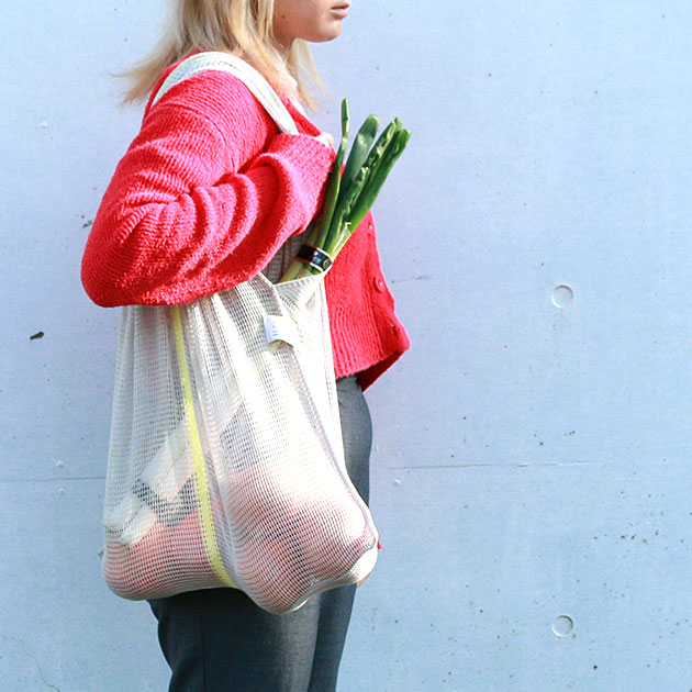 丈夫で乾きやすい荒生地ふきんをエコバッグにしました。メッシュ地のため洗濯機から取り出した瞬間から使えるくらい乾きが早いのが特徴です。ニット独特の伸縮性があるため荷物の形を気にせずにどんどん入れられます。網目が細かいので、物がこぼれ落ちる心配もありません。キッチンでベジバッグとして。タウンユースでエコバッグとして。アウトドアでツール入れとして。いろんな使い方が可能です。