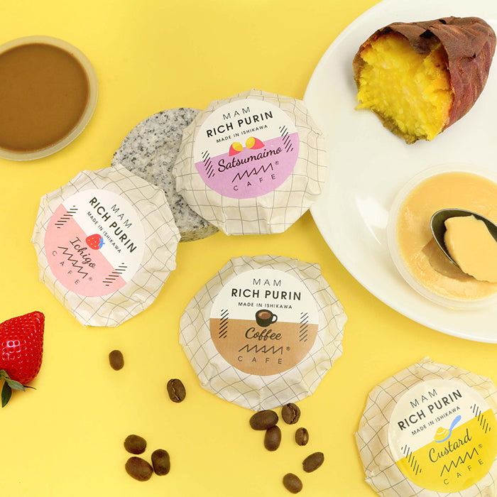 食べきりサイズで満足できる濃厚なプリン。いろんな味を少しずつ楽しみたい方や、まだ多くの量を食べられない小さなお子様など、 いろんな方におすすめなサイズ感です。素材がもつ自然な風味をしっかり味わっていただけることを追求しました。素材の香り、味、食感、色を引き出し、人工甘味料不使用。バラエティに富んだ4種はひとつひとつレシピを変え、本格派の洋菓子デザートのようにお召し上がりいただけます。マーガリンなどの原料になる食用加工油脂を一切使用していません。ミルクとホイップクリームを加えることで、クリーミーでコク深い味に仕上げています。また、天然糖質を使用して甘さがあとを引かず、上品でやわらかな風味です。ICHIGO(イチゴ) いちご本来の酸味と甘みを感じられます。CUSTARD(カスタード) たまごの風味がぎゅっと詰まったプレーンタイプのプリンです。COFFEE(コーヒー) 珈琲ならではのビターな味わいと乳の甘みがミックスされたコーヒープリン。SATSUMAIMO(サツマイモ) 焼き芋ペーストを使用した、芋の風味を感じる豊かな甘み。