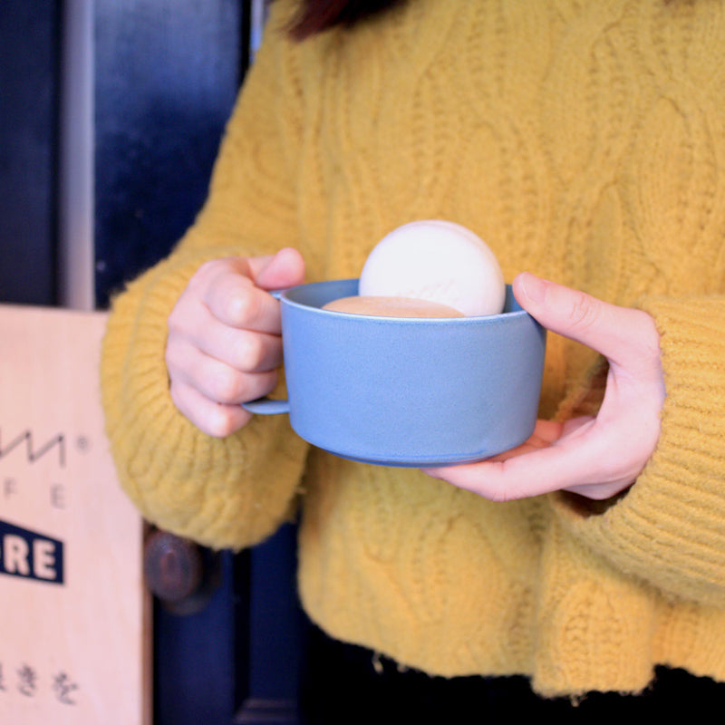 岐阜県土岐市で窯を焼き約100年の、美濃焼の工房で作られたスープカップです。MAM SOUPやMAM OSUIMONO、MISO SOUPを入れたり、具材たっぷりのけんちん汁、牛乳たっぷり入れたコーヒーなど。370MLサイズなのでたっぷり飲めます。