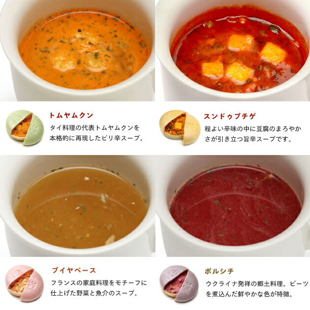 もち米を使用した最中の中に、世界のスープを閉じ込めました。カラフルで可愛らしい最中からは想像もできない、本場の香りと味が楽しめる本格派スープは、食卓にプラスすれば、食欲が上がること間違いなしです。お湯を入れて溶かすと、柔らかくなった最中と世界各地のスープが合わさった今までにない味を味わうことが出来ます。