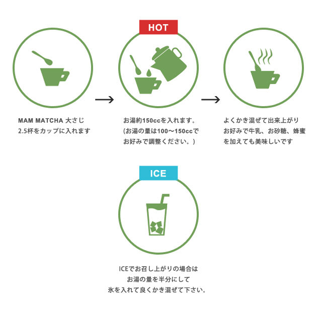 明治元年から続く、自園自製の本当の抹茶。MAM MATCHAの作り方は、カップに粉末とお湯を入れ混ぜるだけ。普段抹茶を飲まない人も、案外簡単だと飲んでみたくなるかも。少量のお湯と氷でアイス抹茶。はちみつや砂糖、牛乳を入れてアレンジも楽しいです。夏も冬も、日本の伝統的な飲み物『抹茶』を生活に取り入れてはいかがでしょう? CHOCOLATE - 芳醇なココアの香りが広がる、Sweet&Bitterな大人の抹茶です。植物性果糖使用でカロリーもカット。MILK - 宇治抹茶をたっぷり使用した、抹茶オーレ。ミルクと相性抜群の、まろやかで優しい口当たりと味が特徴です。