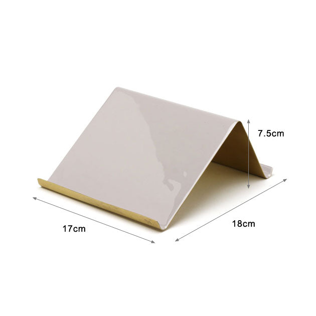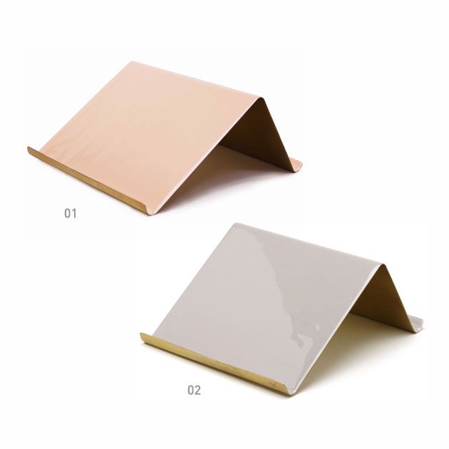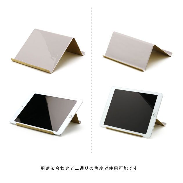 真鍮の板を曲げてニュアンスカラーのエナメルを塗装したシンプルなタブレットスタンド(iPadスタンド)。前後ろで二つの角度が選べる設計で、利用するシーンに合わせて使い分けできる実用性とシックなデザインが魅力です。