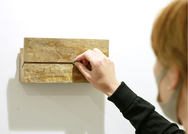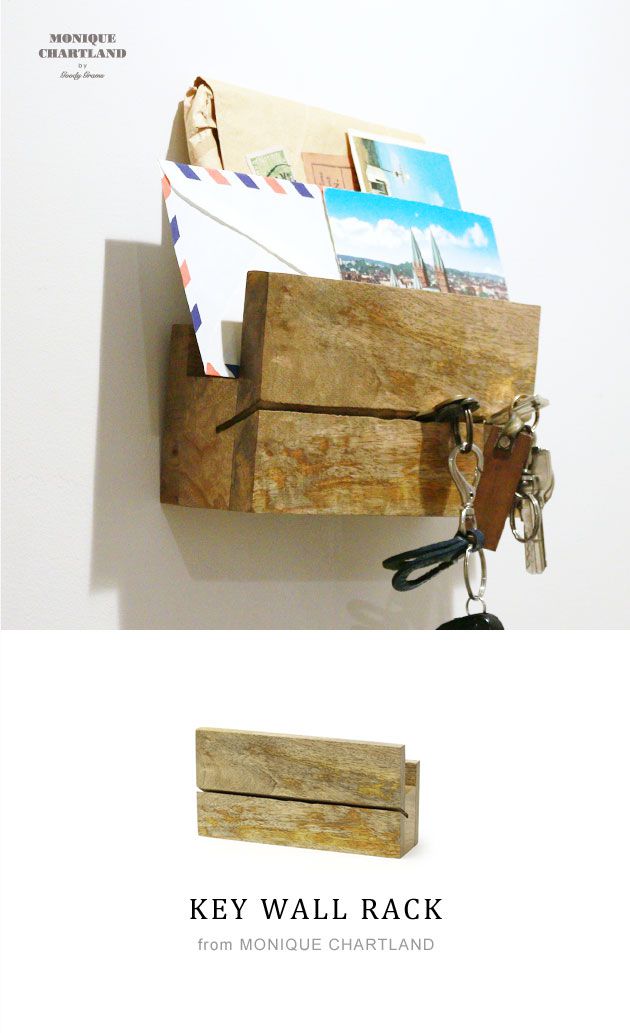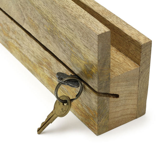 壁掛けでも置いたままでも使用できるキーラック。斜めに入れた溝には鍵を差し込んでおけます。上の棚には手紙や信書など一時保管しておきたいものをスッキリ収納可能です。