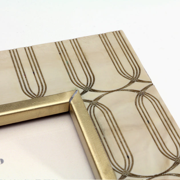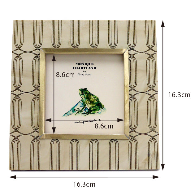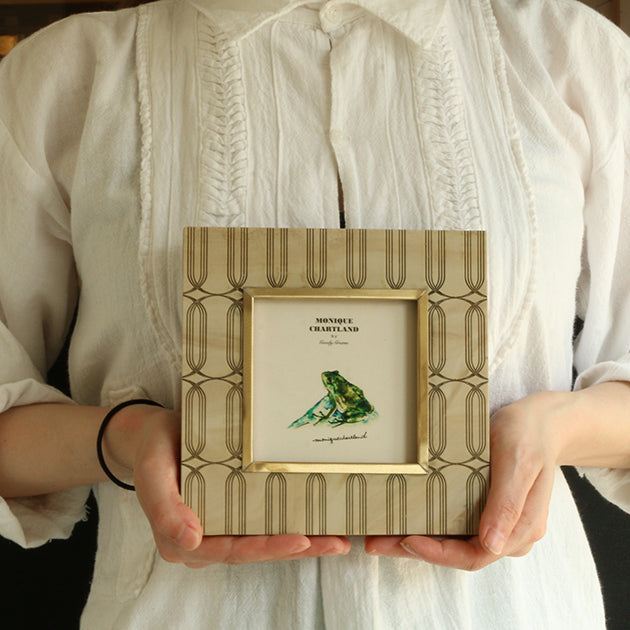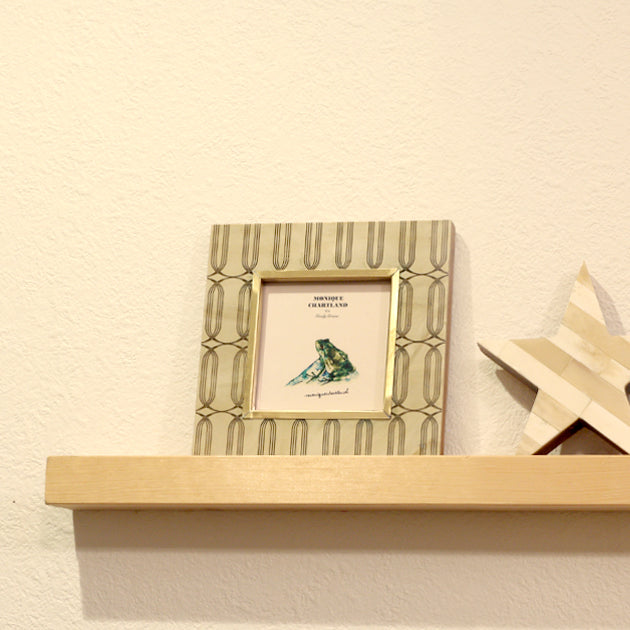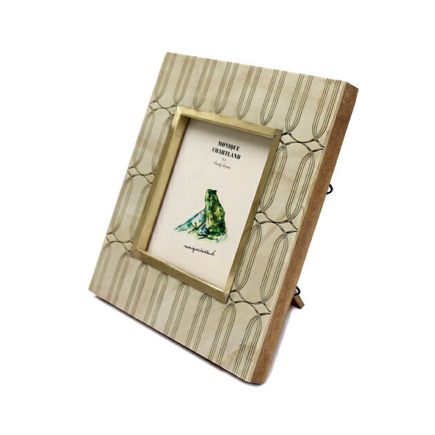 レジンにシンメトリ状に掘り込みを加えたフレーム。中央の真鍮枠がアクセントとなり空間を彩ります。背面にはスタンドと三角吊り金具が付いていますので、置き型と吊り下げの使い方が可能です。