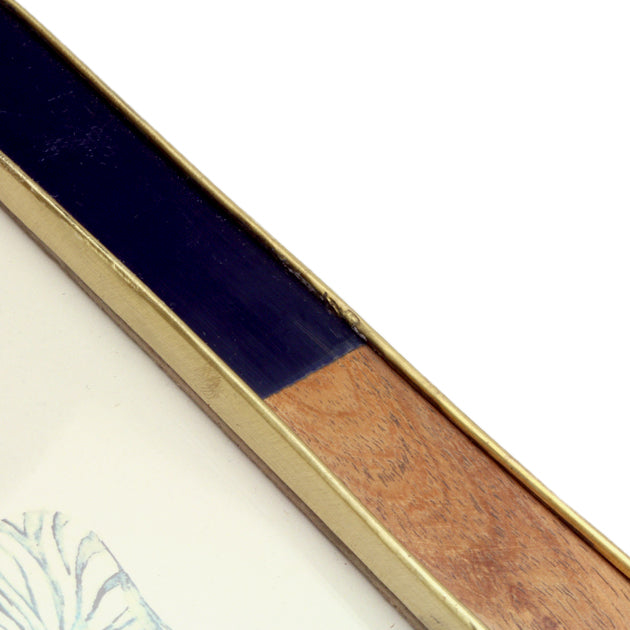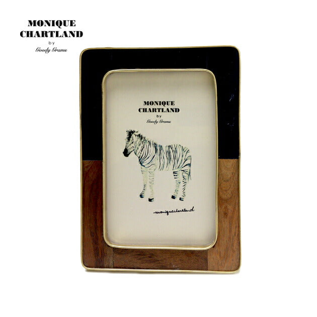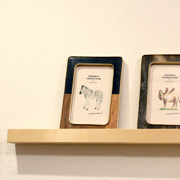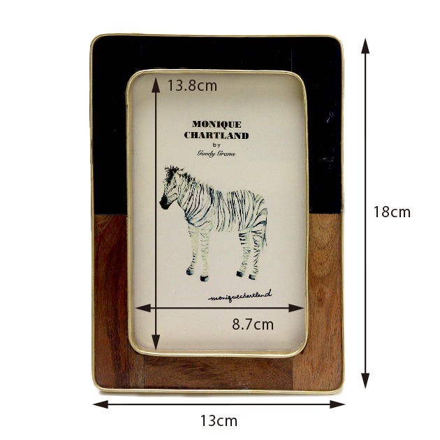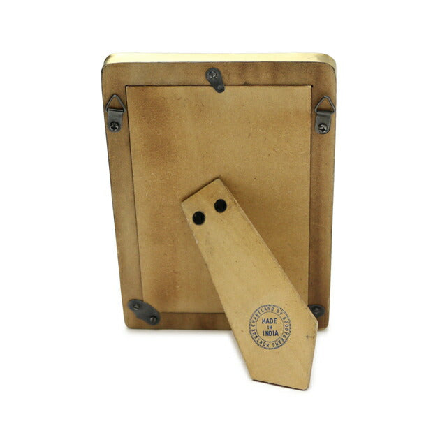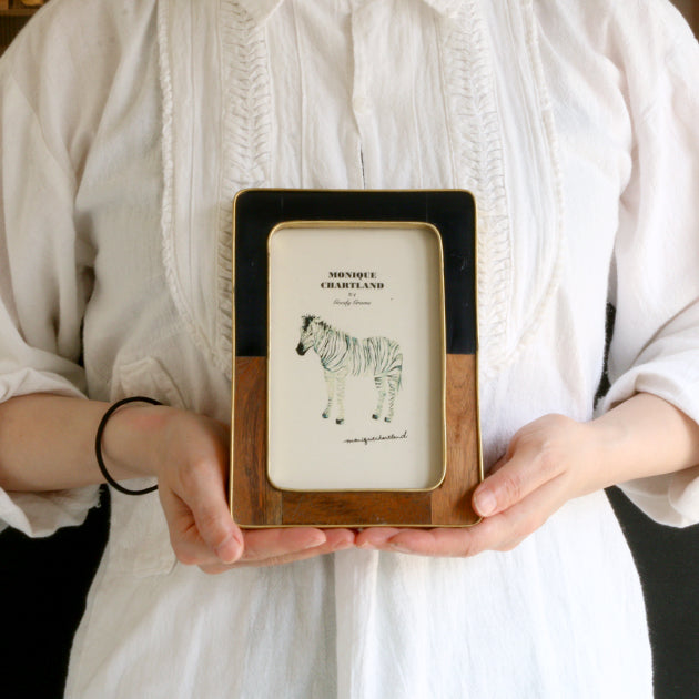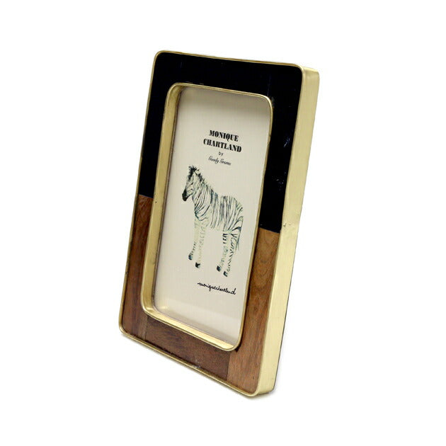 チークウッドと黒のレジンをあしらったフレーム。金色の真鍮がアクセントとなり、木系家具からモダンなインテリアまでマッチいたします。背面にはスタンドと三角吊り金具が付いていますので、置き型と吊り下げの使い方が可能です。
