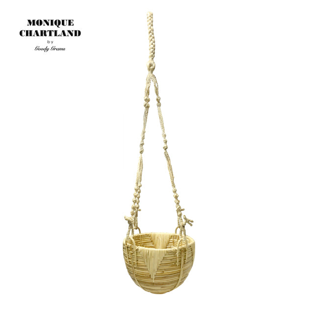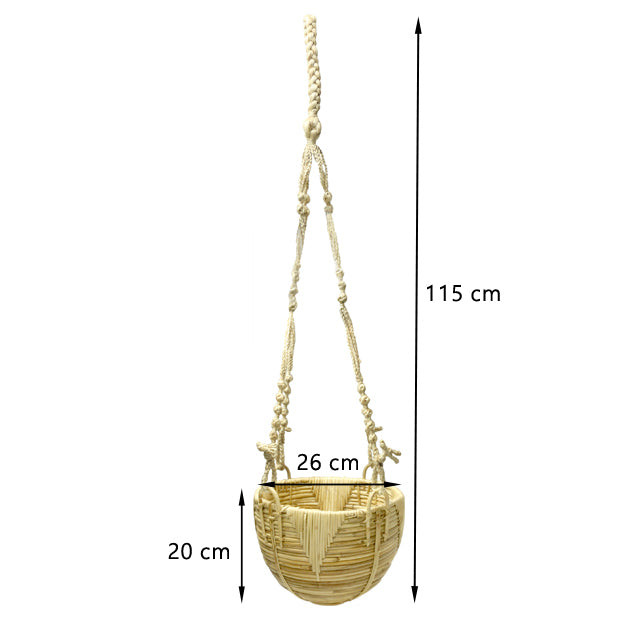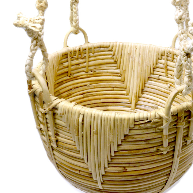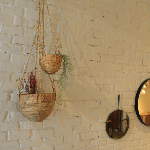 籐のハンガーバスケット。籐の存在感を残しつつもしっかりと編み込まれて少しツヤがかった仕上がりです。グリーンとの相性が良いのでプラントハンガーとしてご利用いただくのもおすすめです。