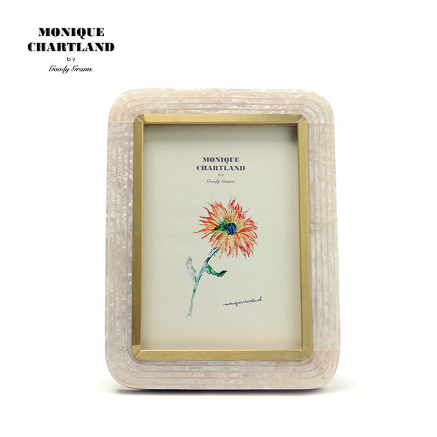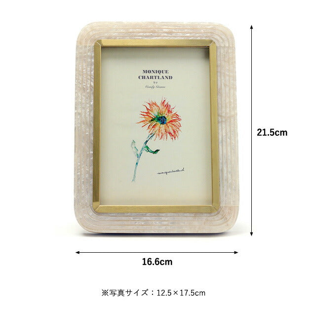 光の反射によってシェルのように光って見える、マーブル模様が特徴のフォトフレーム。真鍮の淵を囲むように線が彫られ、丸い角が柔らかいフェミニンな印象を与えます。