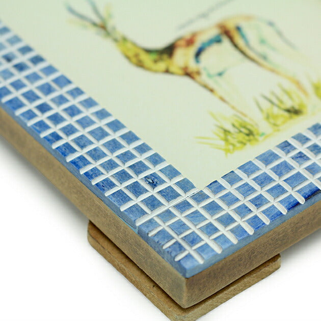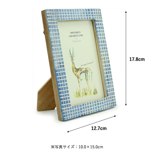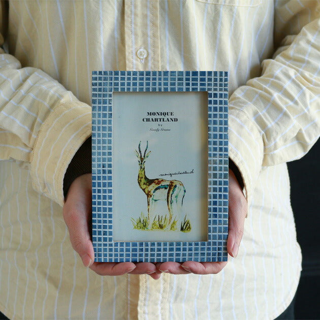 青いタイルが施されたようなフレーム。どんなインテリアにも合わせやすいカラーです。