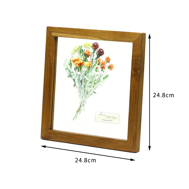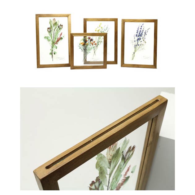 シンプルなウッドフレームに、印象的な様々なドライフラワー。細部まで綺麗に映し出せる高い転写技術を使い、ガラスにドライフラワーをプリントして仕上げました。花の形と色合いを半永久的に楽しめます。