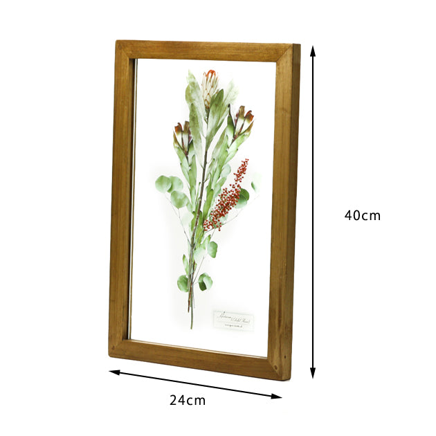シンプルなウッドフレームに、印象的な様々なドライフラワー。細部まで綺麗に映し出せる高い転写技術を使い、ガラスにドライフラワーをプリントして仕上げました。花の形と色合いを半永久的に楽しめます。