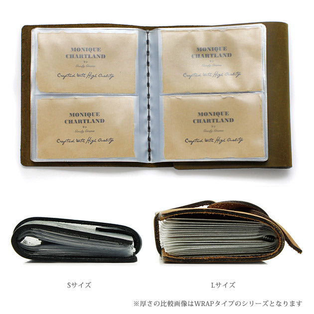 1枚の革を3つ折りにしたシンプルなデザインのカードケース。あえて多くの加工を施さず、自然に近い状態のレザーを使用しているので使い込む程に良い風合いが出ます。ポケットは1枚ずつ収納できるようになっていて、合計40枚のカードをセパレートして管理できます。財布の中のカードがいっぱいになってしまった方や名刺、ポイントカードを管理したい方にお薦めです。ついつい大きなファイルに収納しがちですが、よく使うカードや名刺はこちらに収納しましょう。その他、旅先で手に入れた切手などをファイルしてアルバムのようにして使うのもオススメです。