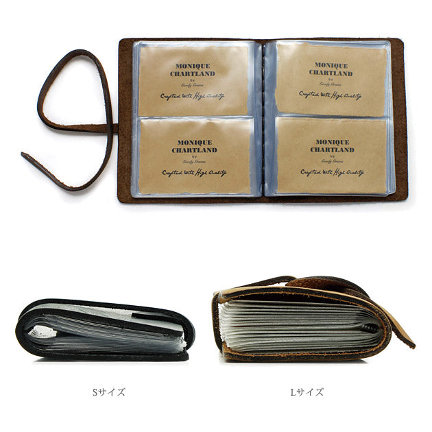 革紐を巻いて留めるシンプルなデザインのカードケース。あえて多くの加工を施さず、自然に近い状態のレザーを使用しているので使い込む程に良い風合いが出ます。ポケットは1枚ずつ収納できるようになっていて、合計40枚のカードをセパレートして管理できます。財布の中のカードがいっぱいになってしまった方や名刺、ポイントカードを管理したい方にお薦めです。ついつい大きなファイルに収納しがちですが、よく使うカードや名刺はこちらに収納しましょう。その他、旅先で手に入れた切手などをファイルしてアルバムのようにして使うのもオススメです。