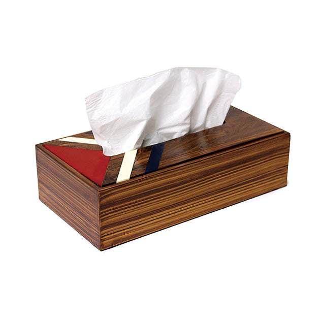 赤・白・紺のレジンの色をポイントにしたティッシュケース。インテリアの中でも忘れがちなティッシュケースに存在感を与えました。ボックス側面の素材は、優れた品質特性を誇るMDF(木材を繊維状にほぐし、接着剤などを配合してボードに成型した「繊維板」の一種)で出来ており、底面は滑り止め仕様となっているので、ご自宅の様々なシーンで安心にお使い頂けます。サイズは、市販の400枚200組(横22.6×縦11.6×高さ5.1cm)のティッシュボックスが収納可能な寸法となっています。