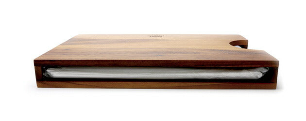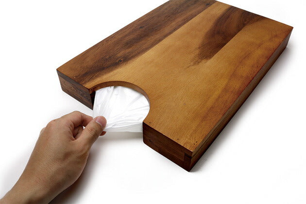45Lのゴミ袋を収納するケース。よく使うのに、見えるところに出しておくとダサい。そんなアイテムのひとつにゴミ袋があります。「○○市指定ごみ袋」とデカデカと書かれ、自治体によってはやけにカラフルで、多言語の説明書き。実用性によせた結果だと思いますが、もう少しなんとかならんものか。そんな悩みを解決してくれるのがこの道具。多くの家庭で使われる45Lのゴミ袋(50枚入り)をスッポリそのまま収納して、ティッシュペーパーのように1枚ずつ取り出すことができます。高級感あるアカシアのボディは、人目につく場所に置いてあっても違和感なし。平置、縦置き、横置きの3通りの使い方ができるのもこのケースの特徴です。厚さ4.5cmとスリムなデザインなので今までデッドスペースとして使えなかった場所を活用してみてはいかがでしょうか。