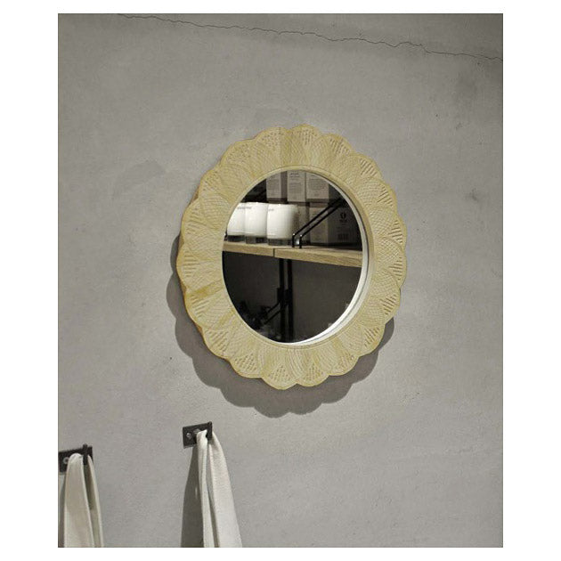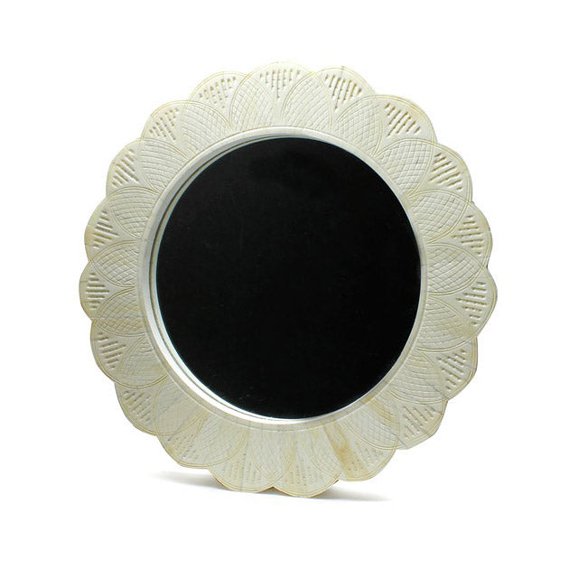 インドの民芸品として伝わる動物の骨の鏡。天寿を全うした動物の骨を利用して、新しい命を吹き込んだものです。素材はバッファロー(水牛)の骨を削り出し、30年の熟練の技術工が手作りで一つ一つを形どり、それを装飾しながら作り上げていきます。こちらはホワイトを基調とした清潔感溢れるミラー。背面にはスタンドとDリングが付いているので、置き型と吊り下げの2種類の使い方が可能です。インドの第一宗教であるヒンドゥー教では、動物、とくに牛は崇拝の対象となっているため、食べることはもちろん殺してはいけません。それらが死んだときに残る骨や角は神聖なものであるため、捨てずに工芸品や装飾品へと形を変え、未来永劫に生きています。それらを身に付けることで自分を守ってくれる、いわば日本のお守りに近いものといえます。歴史上、イギリスの植民地政策を受け、ヨーロッパ文化の影響を受けてきたインドだからこそできる色のバランスや洋風なデザインは、他国では作ることのできない特別な製品となっています。
