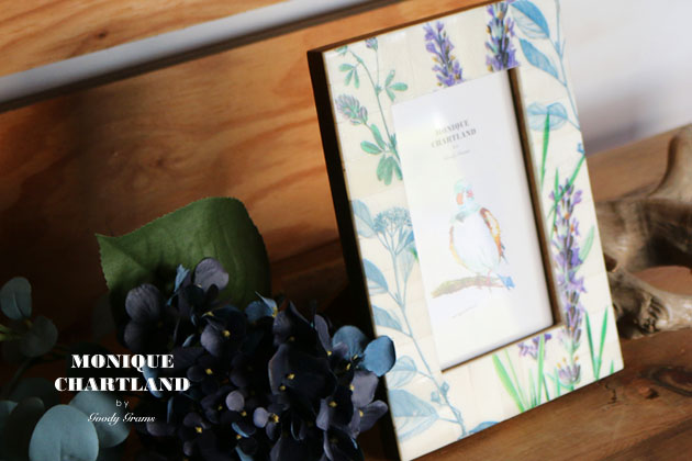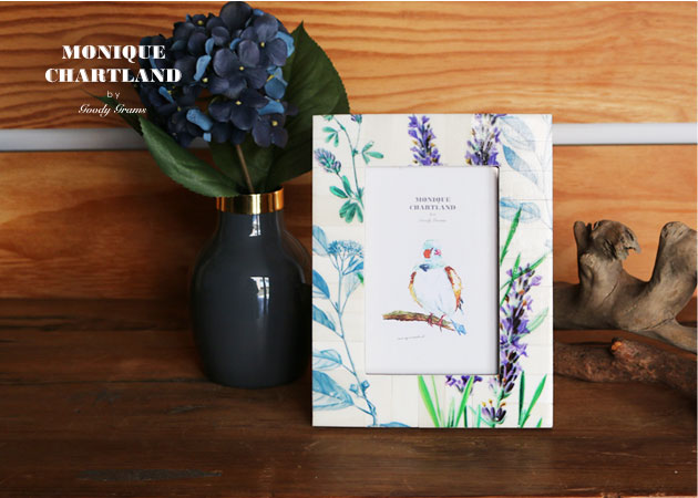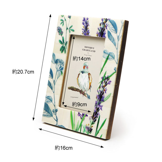 動物の骨でできたフレームに爽やかな野の花がプリントされた写真たて。昇華転写という技術を使用し、絵具の濃淡まで忠実に表現しています。「BOTANICAL 01(ボタニカル01)」は紫の花をメインに、ブルーやグリーンで色付けられた上品な配色で大人の女性におすすめなデザインです。背面にはスタンドとDリングが付いているので、置き型と壁掛け両方の使い方が可能です。