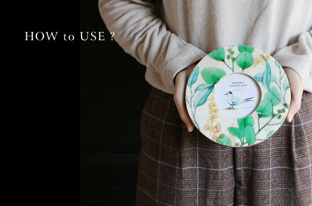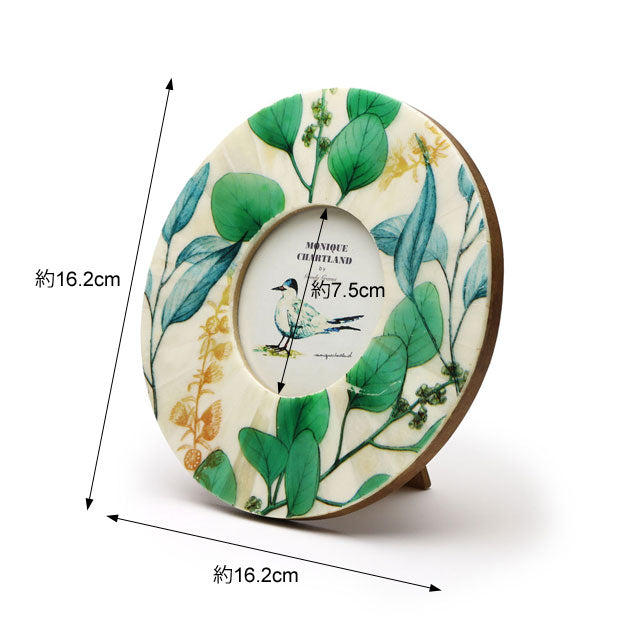 動物の骨でできたフレームに様々な植物がプリントされた丸形の写真たて。昇華転写という技術を使用し、絵具の濃淡まで忠実に表現しています。「BOTANICAL 02(ボタニカル02)」はグリーンの葉っぱをメインに、ブルーやイエローで色付けられた爽やかな配色で大人の女性におすすめなデザインです。背面にはスタンドとDリングが付いているので、置き型と壁掛け両方の使い方が可能です。
