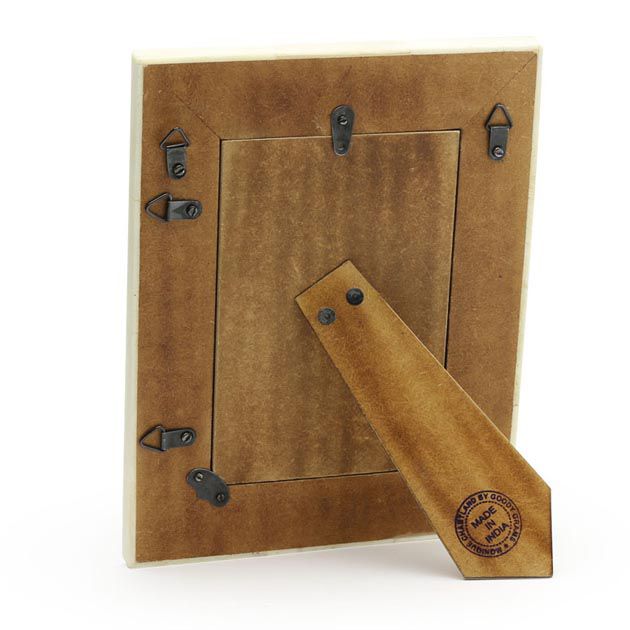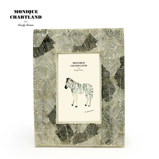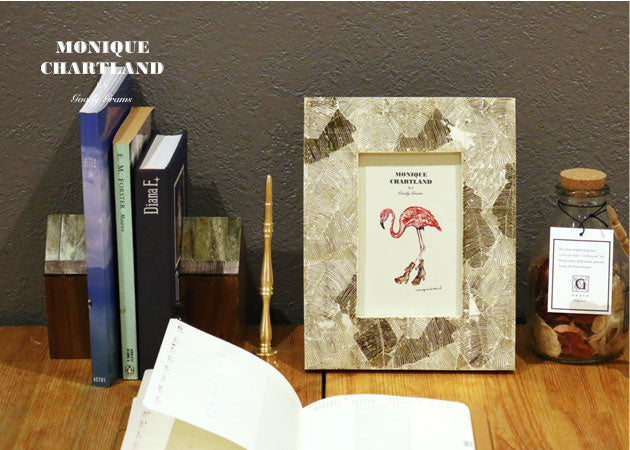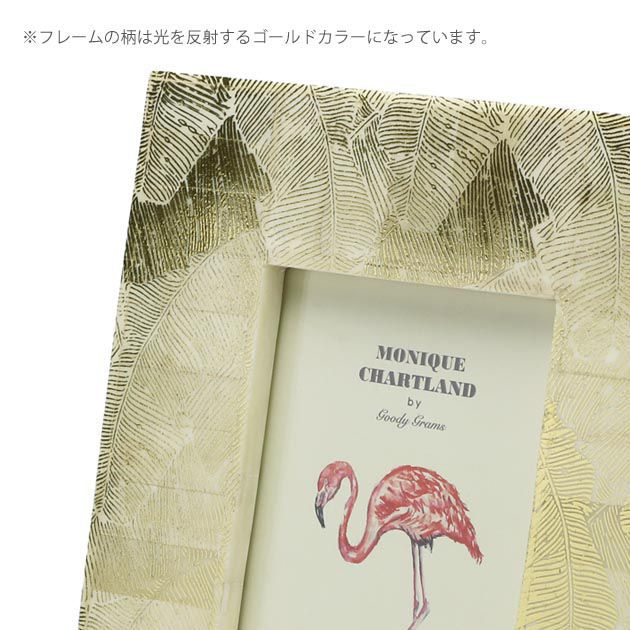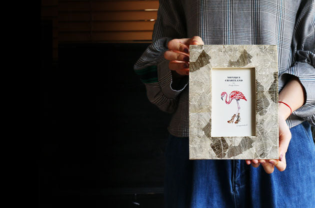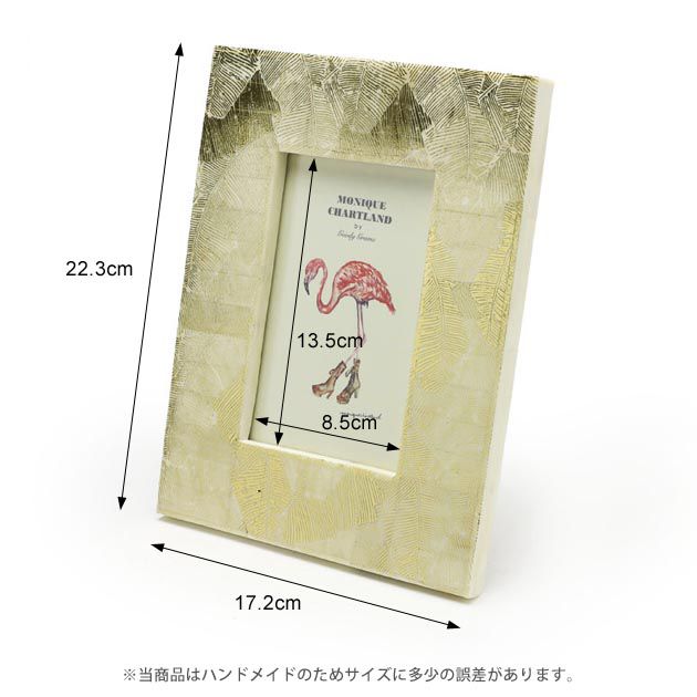 ボーンフレームに葉がおいしげるイラストを金箔で施したフォトフレーム「CHAMAN」。光の当たり方で金箔部分が輝きます。ハンドメイドで作られており、ところどころみられるゆがみや塗装の剥げが量産品にはない味を出しています。背面にはスタンドとDリングが付いているので、置き型と壁掛け両方の使い方が可能です。縦置き横置き両用です。