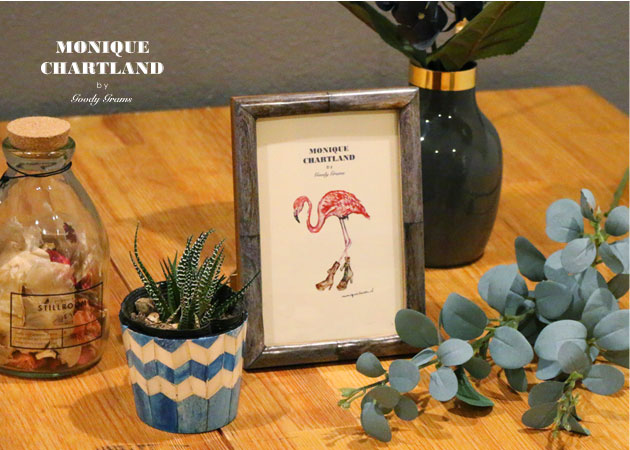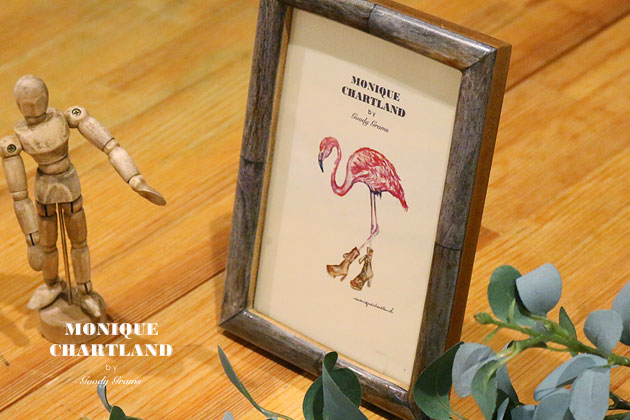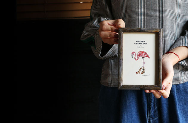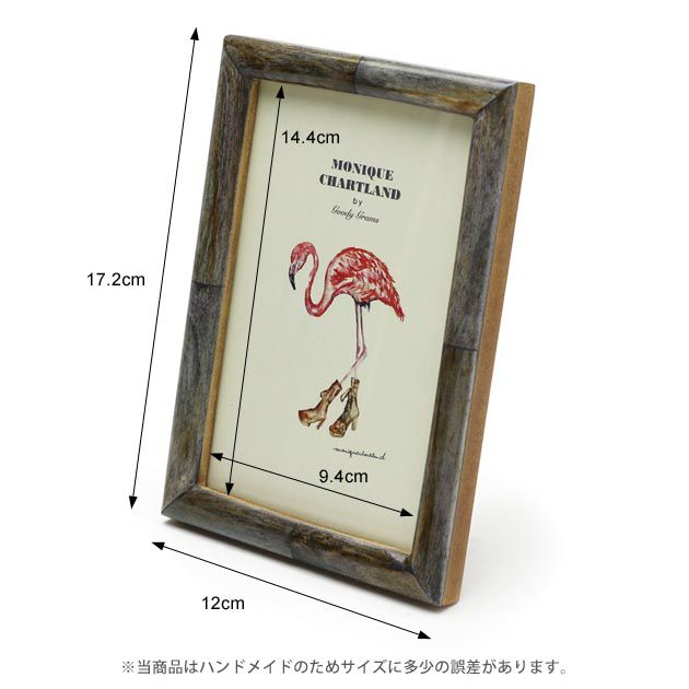 グレーに塗装された骨を使用したボーンフォトフレーム「CHAMELI」。自然素材を使用しているため骨の独特なテクスチャは1つ1つ異なります。ハンドメイドで作られており、ところどころみられるゆがみや塗装の剥げが量産品にはない味を出しています。背面にはスタンドが付いていて縦置き横置き両用です。