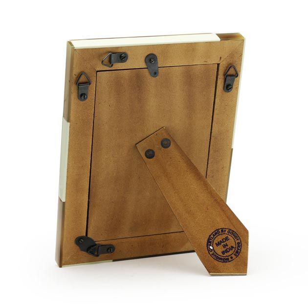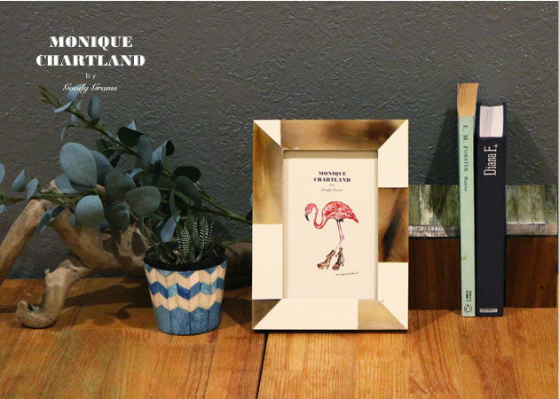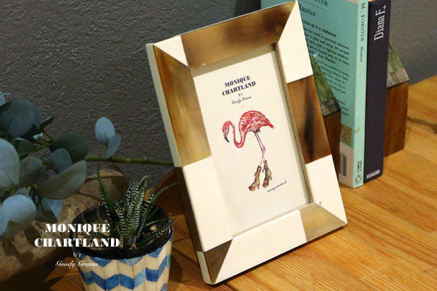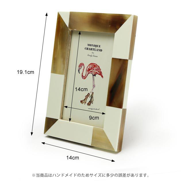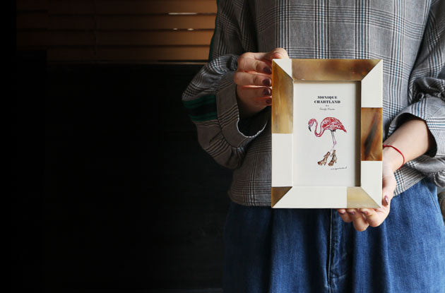 レジンと動物の角(つの)の異素材を組み合わせたフォトフレーム「DAMA」。天然素材の角の模様はべっ甲のようで、1つずつ表情が異なります。ハンドメイドで作られており、ところどころみられるゆがみや塗装の剥げが量産品にはない味を出しています。背面にはスタンドとDリングが付いているので、置き型と壁掛け両方の使い方が可能です。縦置き横置き両用です。