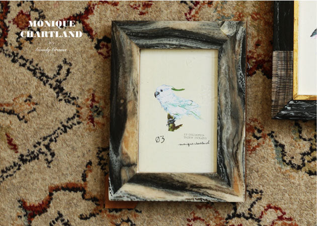 禍々しくも思えるマーブル模様のフォトフレーム。写真だけでなくイラストが描かれたハガキなどを入れてもいいですね。背面にはスタンドとDリングが付いているので、置き型と壁掛け両方の使い方が可能です。