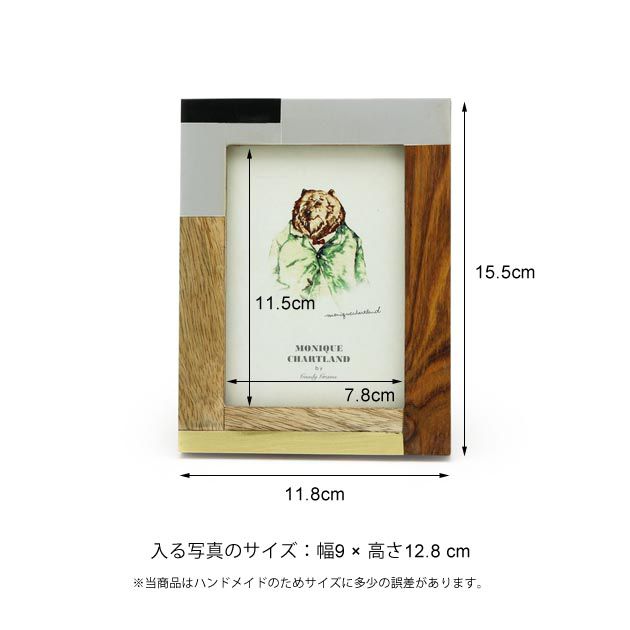 レジン、ウッド、真鍮などの異素材で図形をランダムに配置したフレーム「PHOTO FRAME VYASA」。木材が使われていることでナチュラルな雰囲気がありますが、レジンや真鍮などの長方形の図形が配置されることで都会的な雰囲気もあわせもつ個性的なフレームです。職人が作るハンドメイド製品のためところどころラインのゆがみや塗装の剥げが量産品にはない味を出しています。