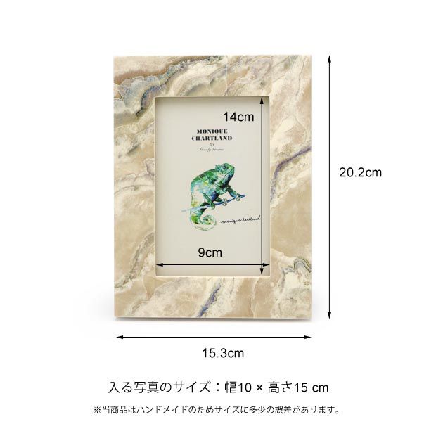大理石のような淡いマーブル模様が特徴のフレーム「PHOTO FRAME VIVEK」。クリーム色のようなグレーのようなベースカラーに濃い色がアクセントになっています。主張しすぎない配色でインテリアになじみやすいフレームです。職人が作るハンドメイド製品のためところどころラインのゆがみや塗装の剥げが量産品にはない味を出しています。背面にはスタンドとDリングが付いているので、置き型と壁掛け両方の使い方が可能です。