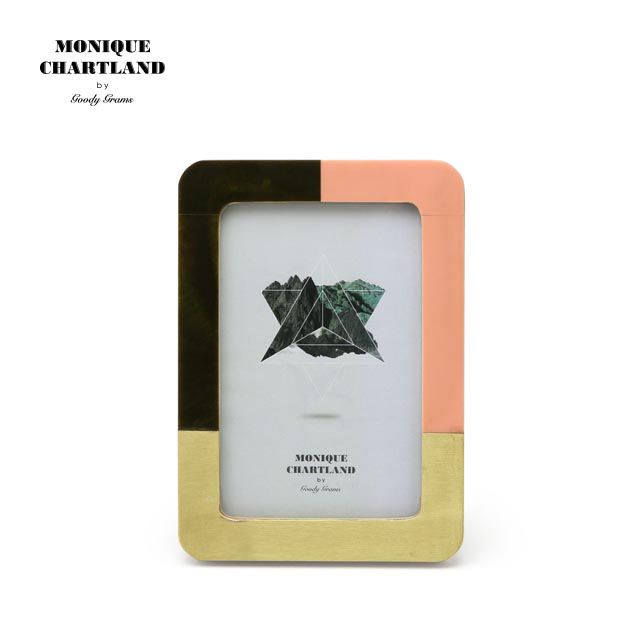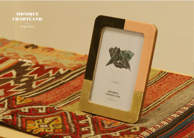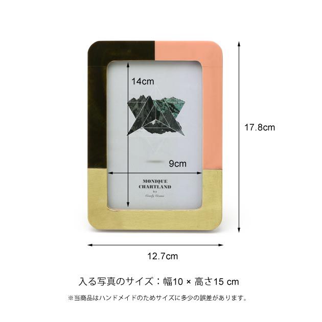 暖色カラーのレジンと真鍮の異素材を組み合わせた角丸フレーム「PHOTO FRAME YADU」。落ち着いたピンクとブラウンの配色がレトロな印象です。職人が作るハンドメイド製品のためところどころラインのゆがみや塗装の剥げが量産品にはない味を出しています。