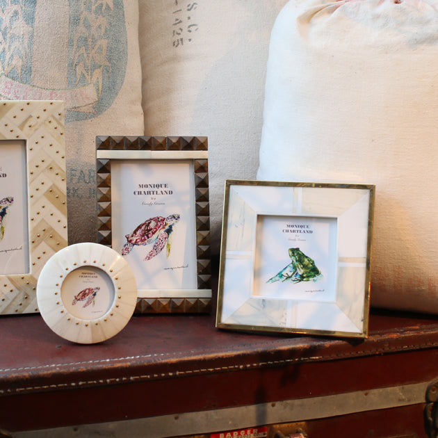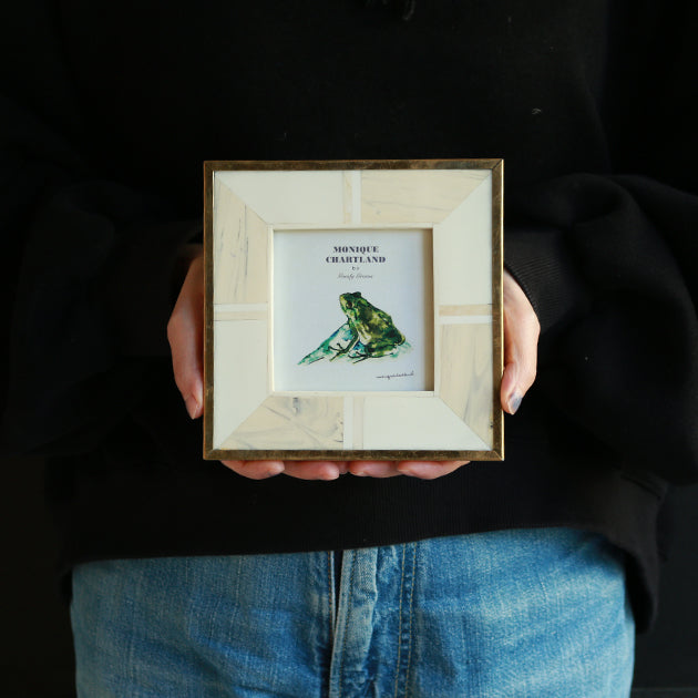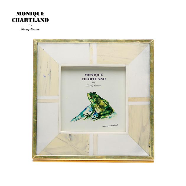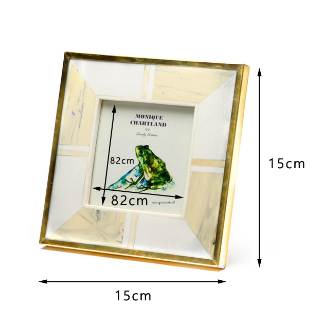 レジンを真鍮で縁どった正方形の写真立て。背面にはスタンドとDリングが付いているので、縦置き、横置き、吊り下げの3種類の使い方が出来ます。