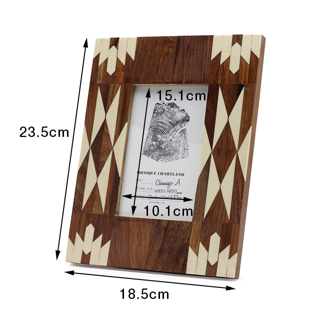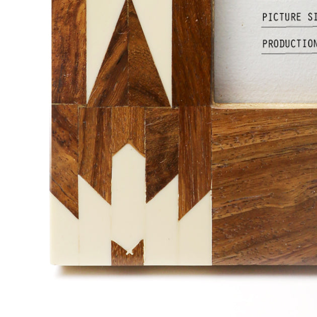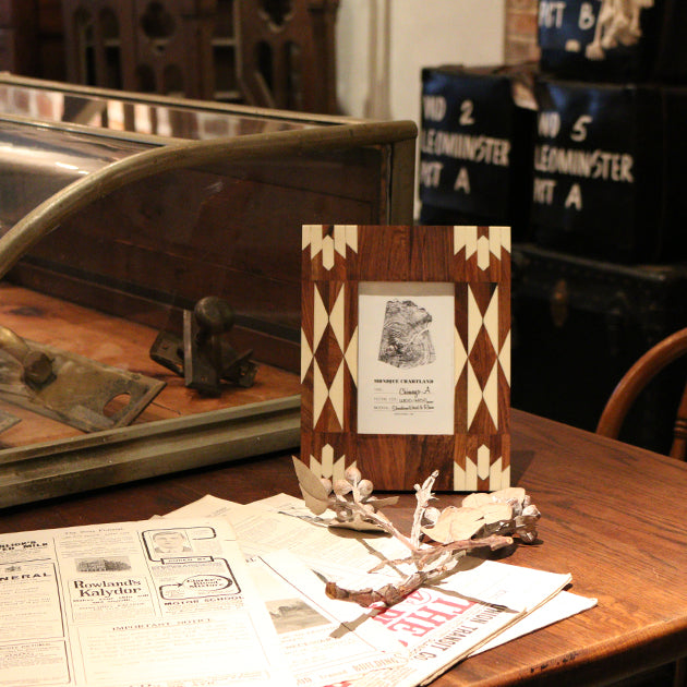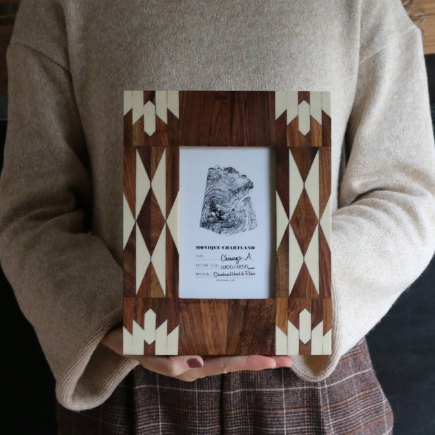 ネイティブ・アメリカンの伝統的なパターンを用いたフォトフレーム。ベースにSHEESHAMWOODを使用しており高級感のある仕上がりとなっています。サイズ展開が豊富なので複数並べてのご使用もおすすめ。背面にはスタンドとDリングが付いているので、置き型と吊り下げの2種類の使い方が可能です。