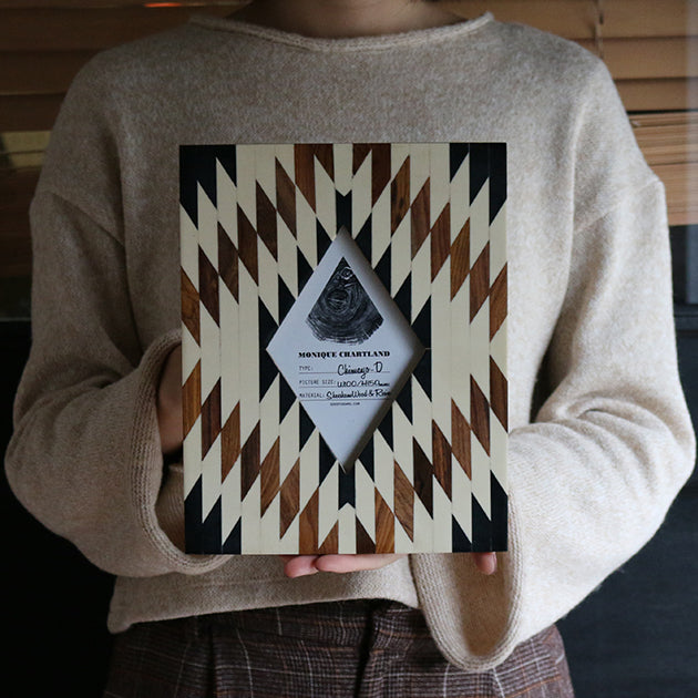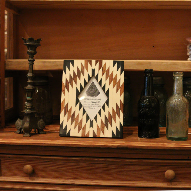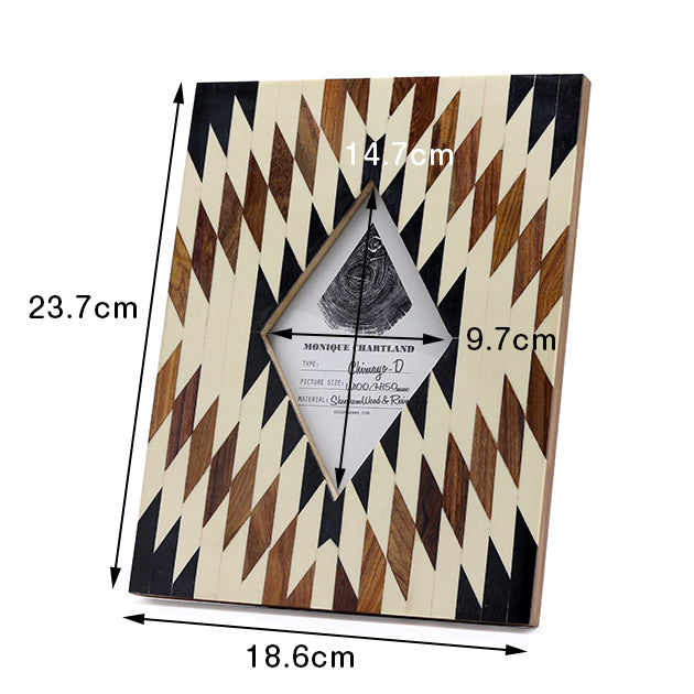 ネイティブ・アメリカンの伝統的なパターンを用いたフォトフレーム。ベースにSHEESHAMWOODを使用しており高級感のある仕上がりとなっています。サイズ展開が豊富なので複数並べてのご使用もおすすめ。背面にはスタンドとDリングが付いているので、置き型と吊り下げの2種類の使い方が可能です。