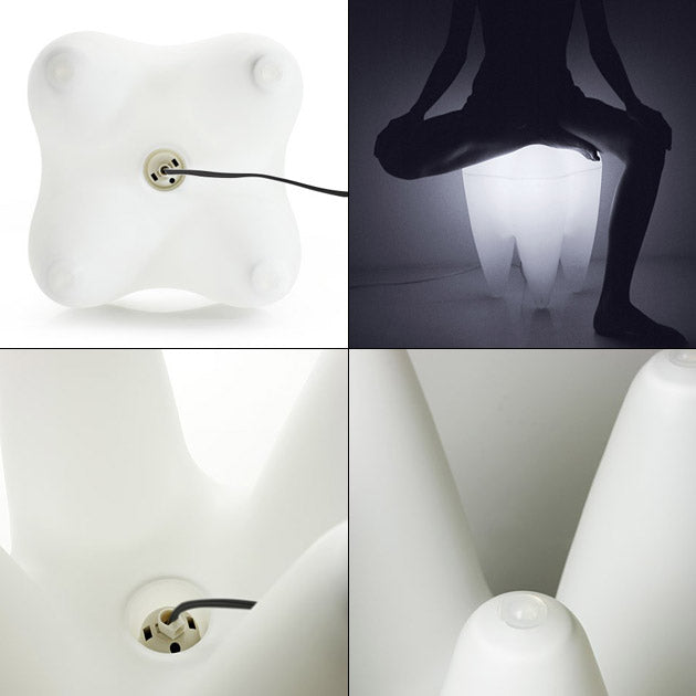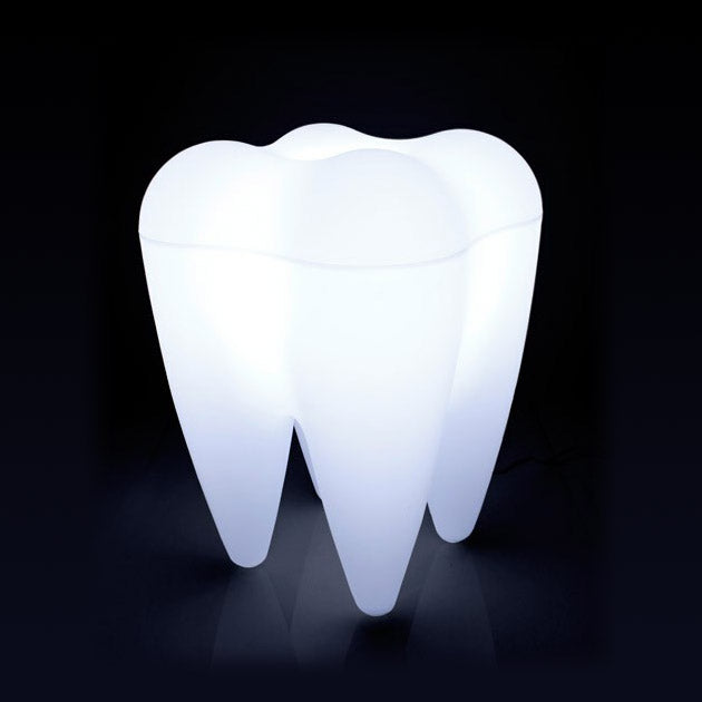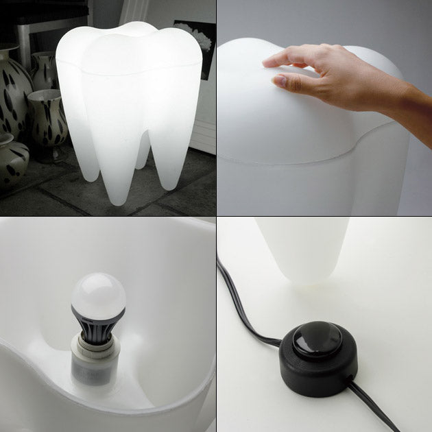 白く輝いた歯の形をした風変りなフロアランプです。80kgまでの荷重に耐えることができますので、ちょっとしたスツールとしても使用できます。電気をつけるとほんのり暖かくなるこのランプが、部屋全体をやさしい光で満たします。カラフルなランプに付け替えるのもいいですが、やはり歯は白が一番です。実は全国の歯科医院でも活躍しているんですよ。
