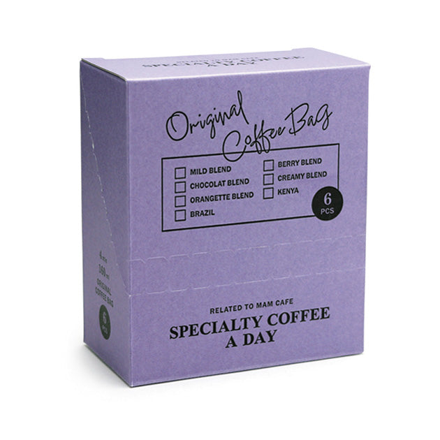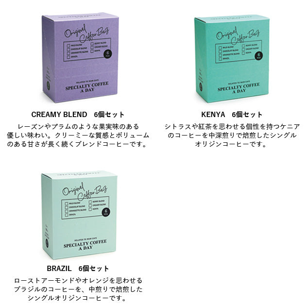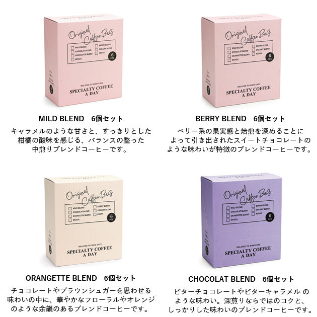 朝起きたとき、ランチのとき、休憩のとき。様々なシーンでコーヒーを楽しむ機会があります。そしてそれは毎日の生活に必要であり、そのときの気分で飲みたいコーヒーも変わるもの。SPECIALTY COFFEE A DAY は、最高の技術を持ちえたチャンピオンクオリティのコーヒーを皆様にお届けいたします。最高のコーヒーで最高の1日をお過ごしください。★すっきりとした味わい ・MILD BLEND ・BRAZIL ★フルーティーな味わい ・BERRY BLEND ・CREAMY BLEND ★コクが豊かな味わい ・ORANGETTE BLEND ・CHOCOLAT BLEND ・KENYA SCAD MILD BLEND : キャラメルのような甘さと、すっきりとした柑橘の酸味を感じる、バランスの整った中煎りブレンドコーヒーです。SCAD BERRY BLEND : ベリー系の果実感と焙煎を深めることによって引き出されたスイートチョコレートのような味わいが特徴のブレンドコーヒーです。SCAD ORANGETTE BLEND : チョコレートやブラウンシュガーを思わせる味わいの中に、華やかなフローラルやオレンジのような余韻のあるブレンドコーヒーです。SCAD CHOCOLAT BLEND : ビターチョコレートやビターキャラメルのような味わい。深煎りならではのコクと、しっかりした味わいのブレンドコーヒーです。SCAD CREAMY BLEND : レーズンやプラムのような果実味のある優しい味わい。クリーミーな質感とボリュームのある甘さが長く続くブレンドコーヒーです。SCAD KENYA : シトラスや紅茶を思わせる個性を持つケニアのコーヒーを中深煎りで焙煎したシングルオリジンコーヒーです。SCAD BRAZIL : ローストアーモンドやオレンジを思わせるブラジルのコーヒーを、中煎りで焙煎したシングルオリジンコーヒーです。