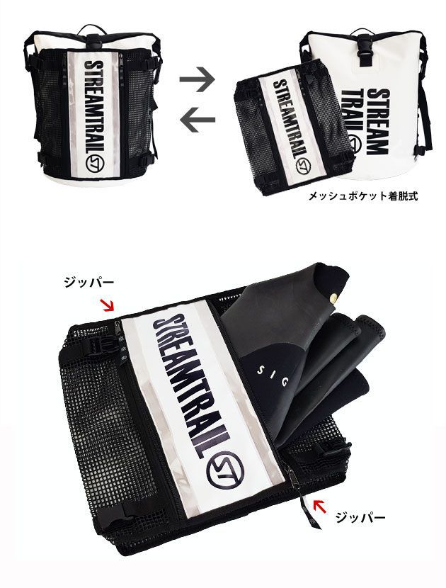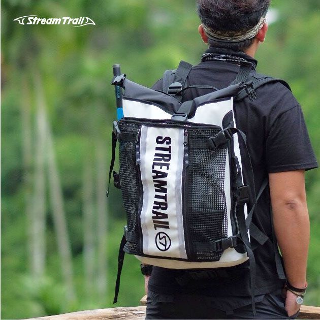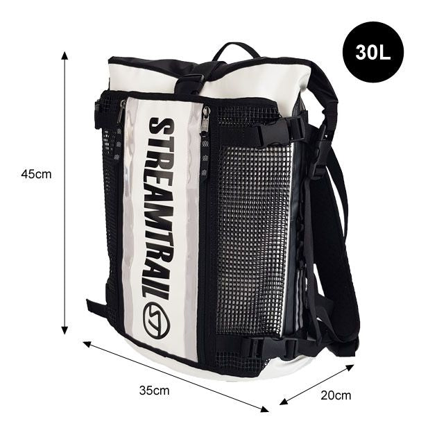 Stream trail人気のバックパック「Roadster」が復活。取り外しできるメッシュポケットが最大の特徴で、Stream trailの他バッグと同様、高い防水性を備えています。容量は30LとDrytank25Lよりも少し大きめですが、別売インナーケースなどはDrytankと同じものを使用可能。マリンスポーツなどでの使用はもちろん、通勤通学などにも使用したいバッグです。