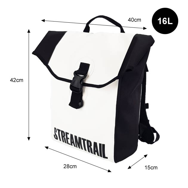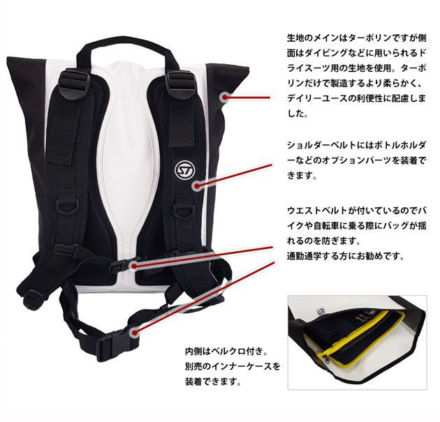 シンプルにフラップアップで使いやすいバックパックです。本体のメイン素材はターポリンですが、側面にはダイビングスーツと同じ素材を使用。どちらの素材も防水性に優れていますが、ダイビングスーツ素材のほうが柔らかく、本体の一部に使用することでデイリーユースの利便性がアップしています。バイクや自転車での通学・通勤にもオススメ。バッグ内側にはベルクロが付いているので別売 Tank Inner シリーズを取り付けることができます。