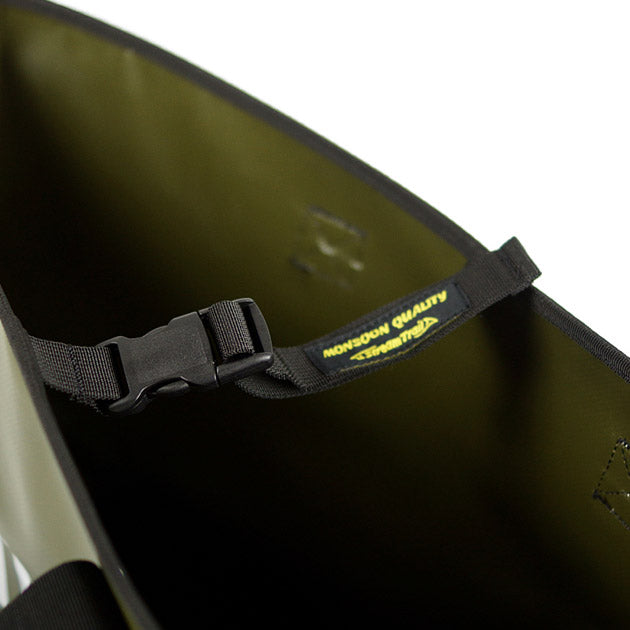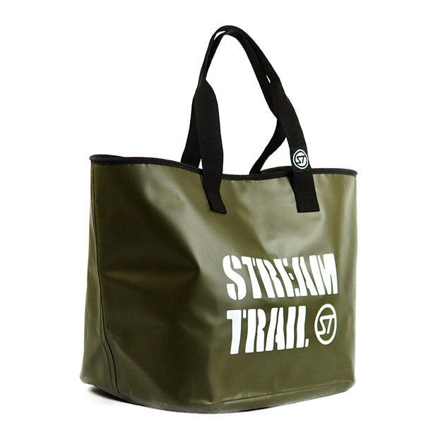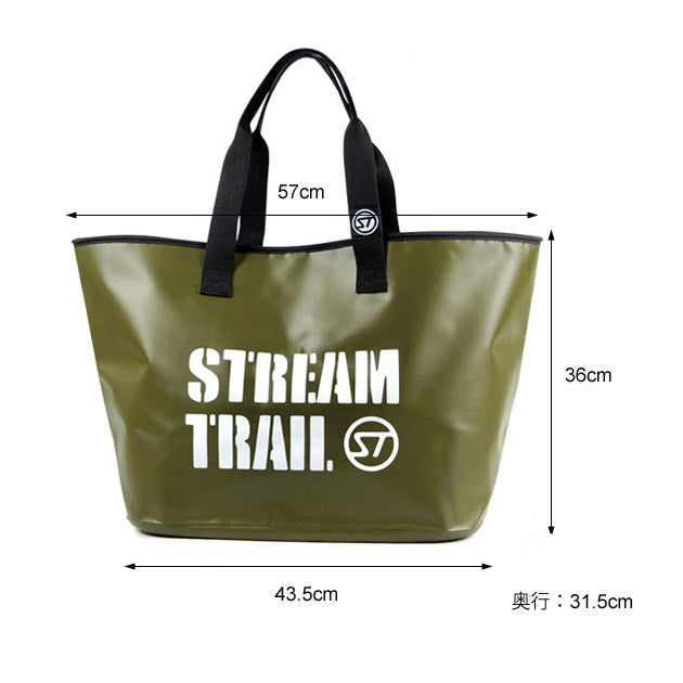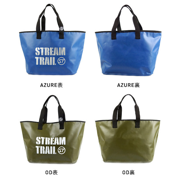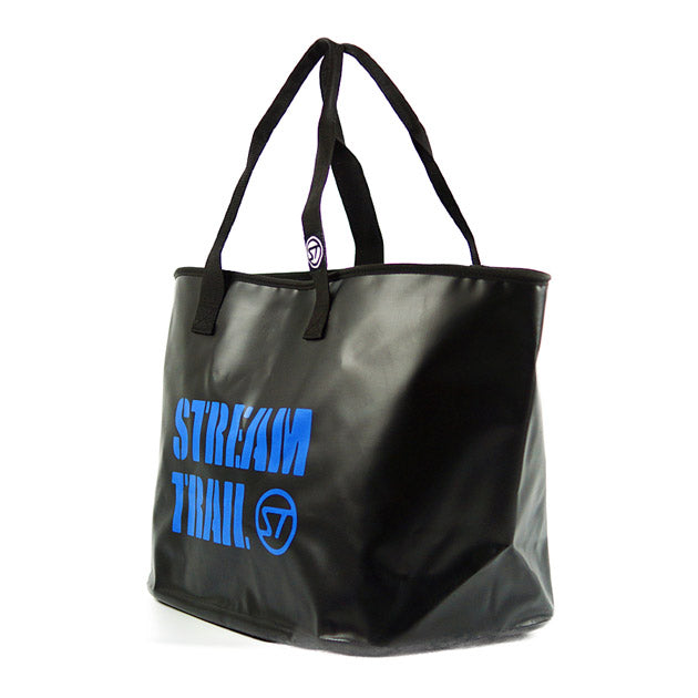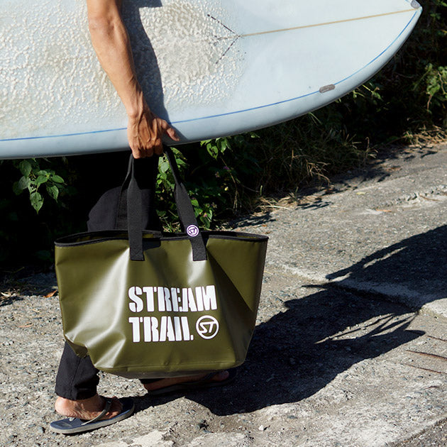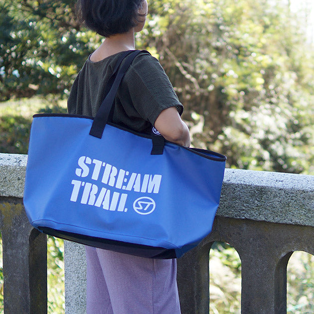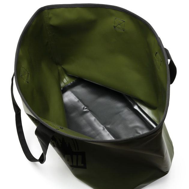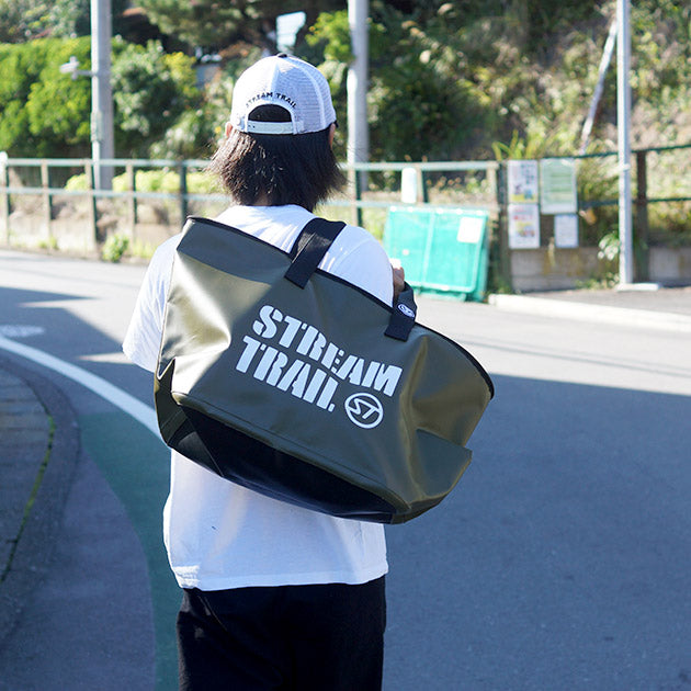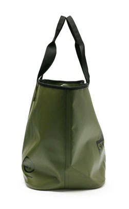 格子状のポリエステルシートを塩化ビニール樹皮でサンドし抜群の強度と防水性を兼ね備えたターポリン素材を使用しており、内側からも外側からも水が沁みこみにくいためマリンスポーツや水辺でのレジャーの際、濡れた道具を収納するのに適した大型トートバッグです。アウトドアをイメージさせるロゴデザインを取り入れ、幅広い年代の方が使いやすいバッグです。