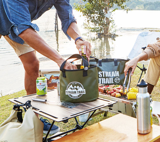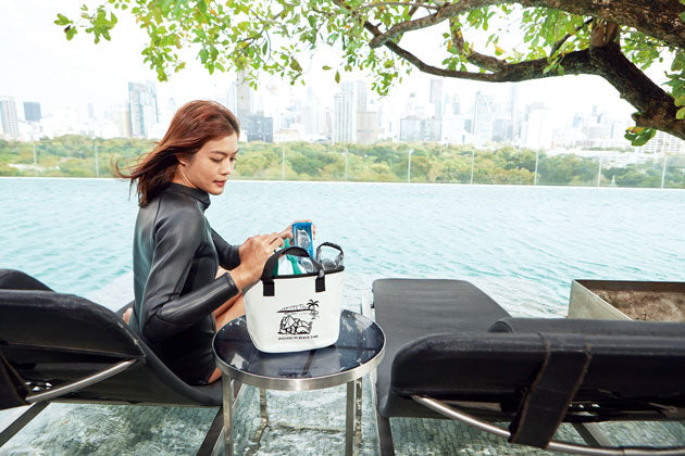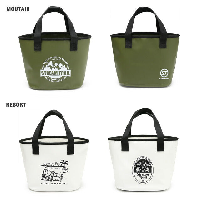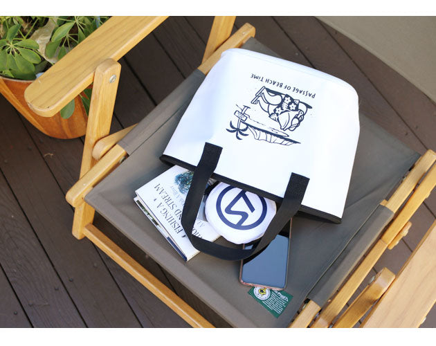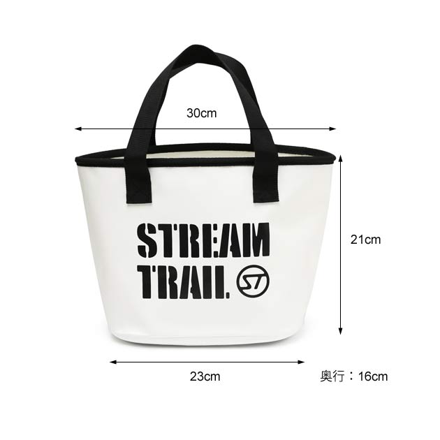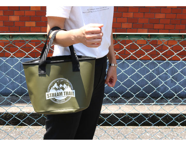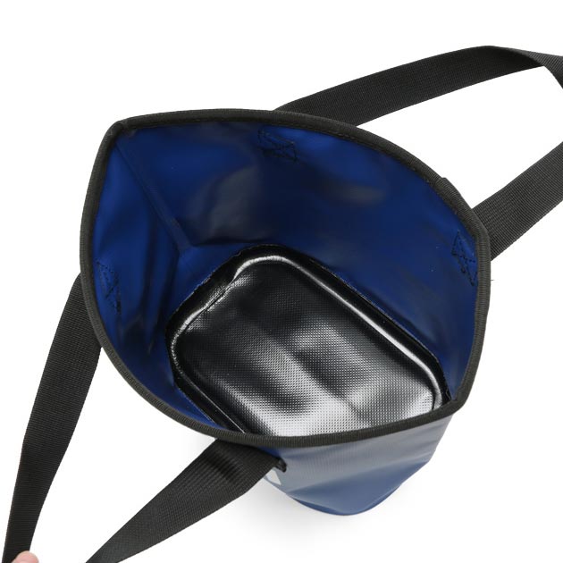 コンパクトに見えますが、長財布を横にして入れられるゆったりサイズ。格子状のポリエステルシートを塩化ビニール樹皮でサンドし抜群の強度と防水性を兼ね備えたターポリン素材を使用しており、ボトムとサイドの生地のつなぎ目にはウエルダー加工を施しているため、外側からも内側からも水が沁みこみにくいため、飲み物が漏れていたり、お弁当の汁漏れなどがあってもバッグの外側に沁み出ることがありません。ちょっとした水分や汚れであればサッと拭けば簡単に取れるので、メンテナンスもらくちん。