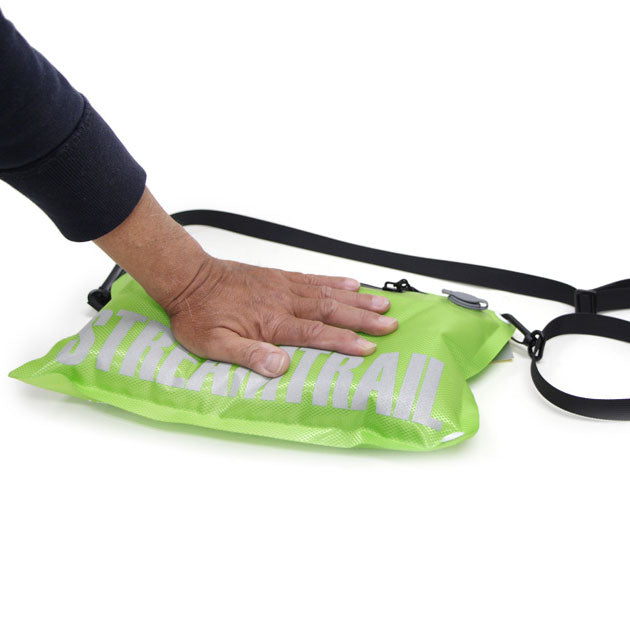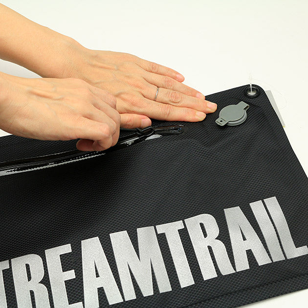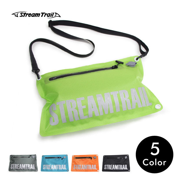 防水性、気密性の高いStream Trailのサコッシュ。逆止栓バルブにより内部の空気量を調整できるのが特徴で、空気を入れて膨らませておけば中身を保護でき、また水面に落としても浮くためマリンスポーツや水辺のレジャーの際に重宝します。ストラップホールは長辺と短編両方につけられており、バッグを縦向き横向きどちらでもご利用いただけます。またバッグ以外にも、中に空気が入れられることを利用してクッションや簡易枕にすることも可能です。