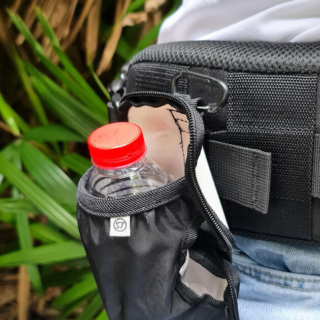 スクエア型に折りたたむことができるボトルホルダーです。バッグのベルトやDカンなどに装着でき、ボトルホルダーとして使用しない時はコンパクトに持ち歩けます。