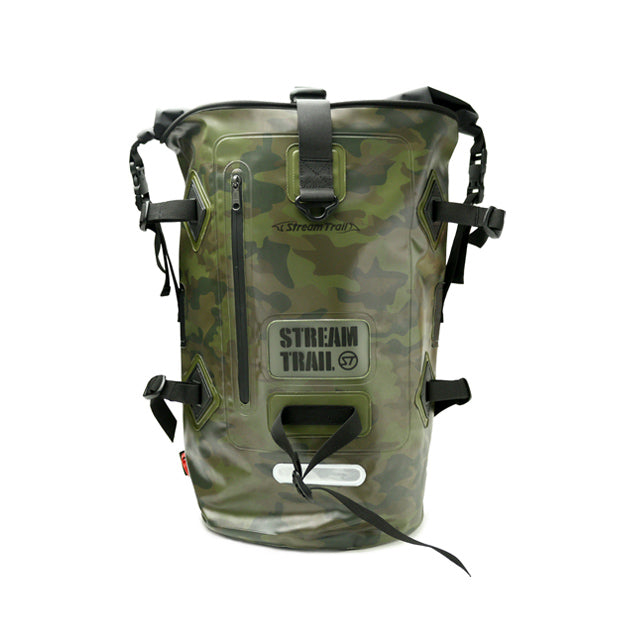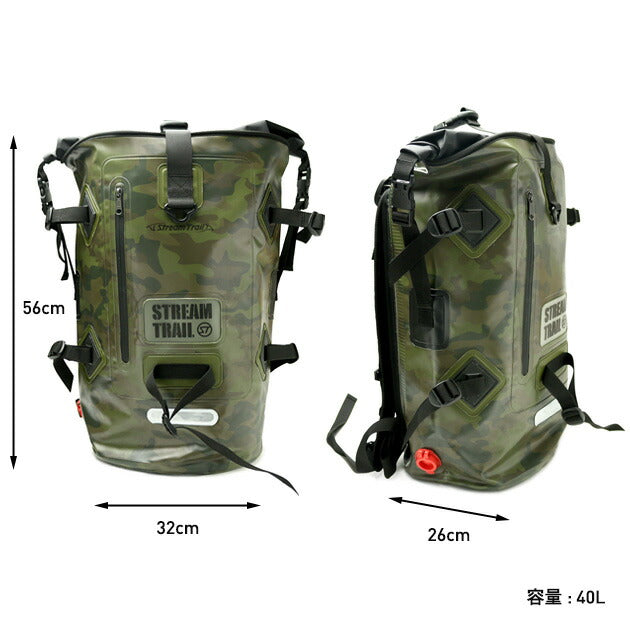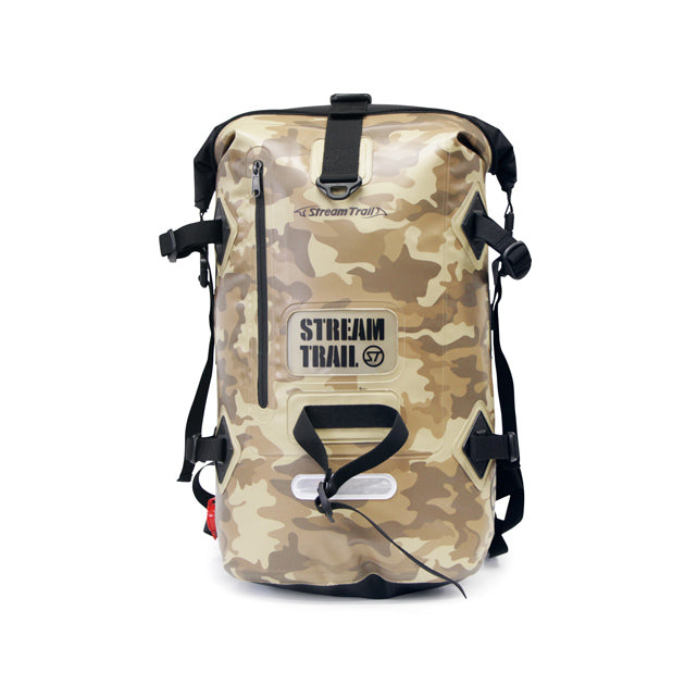 2泊~3泊程度の旅行またはツーリングやダイビングの遠征などにお使いいただける容量のバックパック。DRY TANKは抜群の防水性能を誇るストリームトレイルのベーシックなモデルです。防水バッグに使用されている表面素材の《ターポリン》は、ポリエステル系の繊維を合成樹脂フィルムではさんで溶着したものです。テントやよく街で目にする屋外広告の横断幕、工事現場などでも使われており、水に強く、過酷な状況下でも裂けたりしにくく、摩擦にも強い生地となっています。水の入りやすい開口部は、防水加工を施したフラップをロールダウンすることにより抜群の防水性能を発揮するとともに、ロールしやすい柔らかい生地を採用しています。多少の汚れでも簡単に拭き取ることができるため、手入れもしやすいため、フィールドにもタウンにも使用いただけます。濡れたものを収納しても内部にたまった水はドレインプラグから排出可能です。DRY TANK 40Lのカモフラージュ柄は、2色展開。暗すぎず、主張も強すぎないカモフラージュの定番GREENと、自然に馴染む落ち着いたアースカラー・SANDです。DRY TANKシリーズは、本格的なアウトドアからデイリーユースまで様々なシーンで活躍します。小物の収納には、ベルクロテープで着脱できる4タイプのインナーポケットをオプションでご用意しております。また、DRY TANKシリーズ全てに外付けができるドリンクホルダーとモバイルホルダーもご用意しております。※インナー・ホルダーは別売りです。開口部はロールダウンフラップ仕様 ・水の浸入を防ぐため開口部に防水性のフラップが付いています。ロールダウンする事で高い防水性を発揮します。雨が降ってきたときなどに有効です。また、バッグを横に倒した際に中身が飛び出る事もありません。・ターポリン生地は温度が下がると硬くなる性質があるため、常に柔軟性の要求されるフラップ部には低温時でも硬化しないナイロン生地を使用しています。