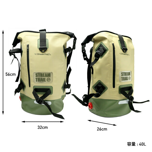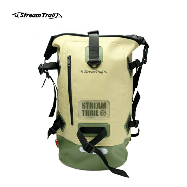 2泊~3泊程度の旅行またはツーリングやダイビングの遠征などにお使いいただける容量のバックパック。DRY TANK D2シリーズは抜群の防水性能を誇るストリームトレイルのベーシックなモデルです。防水バッグに使用されている表面素材の《ターポリン》は、ポリエステル系の繊維を合成樹脂フィルムではさんで溶着したものです。テントやよく街で目にする屋外広告の横断幕、工事現場などでも使われており、水に強く、過酷な状況下でも裂けたりしにくく、摩擦にも強い生地となっています。水の入りやすい開口部は、防水加工を施したフラップをロールダウンすることにより抜群の防水性能を発揮するとともに、ロールしやすい柔らかい生地を採用しています。多少の汚れでも簡単に拭き取ることができるため、手入れもしやすいため、フィールドにもタウンにも使用いただけます。濡れたものを収納しても内部にたまった水はドレインプラグから排出可能です。自然に馴染むアースカラー2色を配色したバックパック。釣りやキャンプといったアウトドアシーン、旅行や出張など、十分な容量と耐久性で様々なシーンをサポートします。DRY TANKシリーズは、本格的なアウトドアからデイリーユースまで様々なシーンで活躍します。小物の収納には、ベルクロテープで着脱できる4タイプのインナーポケットをオプションでご用意しております。また、DRY TANKシリーズ全てに外付けができるドリンクホルダーとモバイルホルダーもご用意しております。※インナー・ホルダーは別売りです。開口部はロールダウンフラップ仕様 ・水の浸入を防ぐため開口部に防水性のフラップが付いています。ロールダウンする事で高い防水性を発揮します。雨が降ってきたときなどに有効です。また、バッグを横に倒した際に中身が飛び出る事もありません。・ターポリン生地は温度が下がると硬くなる性質があるため、常に柔軟性の要求されるフラップ部には低温時でも硬化しないナイロン生地を使用しています。