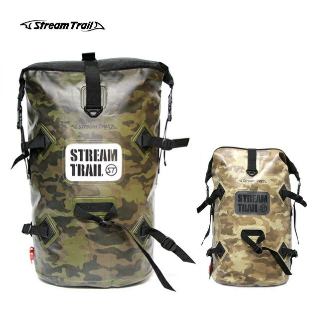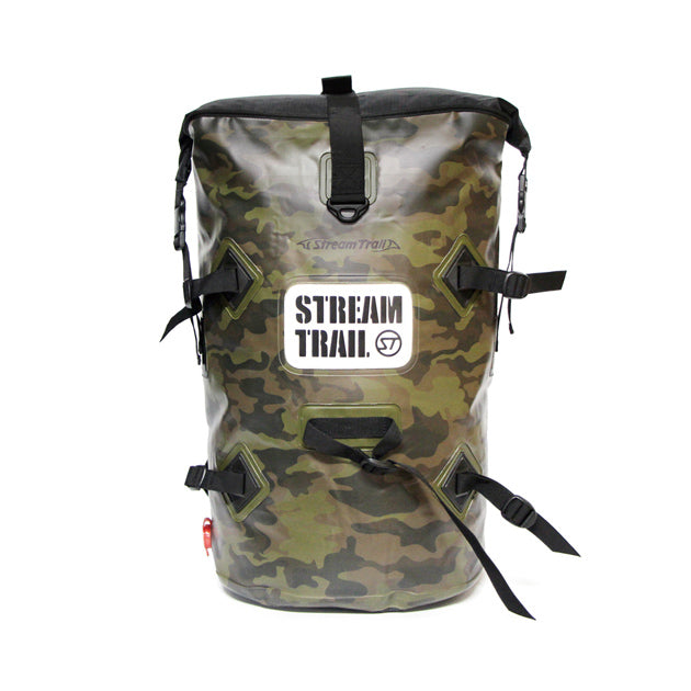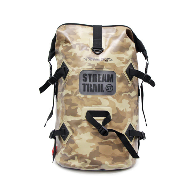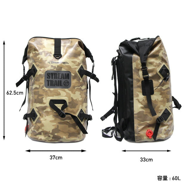 DRY TANK 60Lはシリーズ最大の大容量モデル。余裕の大容量で、長期の旅行や本格的なアウトドアシーンで活躍します。遊びごころを加えたカモフラージュ柄をアースカラーで配色しました。抜群の防水性能を誇るストリームトレイルのベーシックなバックパックです。防水バッグに使用されている表面素材の《ターポリン》は、ポリエステル系の繊維を合成樹脂フィルムではさんで溶着したものです。テントやよく街で目にする屋外広告の横断幕、工事現場などでも使われており、水に強く、過酷な状況下でも裂けたりしにくく、摩擦にも強い生地となっています。水の入りやすい開口部は、防水加工を施したフラップをロールダウンすることにより抜群の防水性能を発揮するとともに、ロールしやすい柔らかい生地を採用しています。多少の汚れでも簡単に拭き取ることができるため、手入れもしやすいため、フィールドにもタウンにも使用いただけます。濡れたものを収納しても内部にたまった水はドレインプラグから排出可能です。DRY TANKシリーズは、豊富なサイズバリエーションとカラーバリエーションで本格的なアウトドアからデイリーユースまで様々なシーンで活躍します。小物の収納には、ベルクロテープで着脱できる4タイプのインナーポケットを、オプションでご用意しております。また、DRY TANKシリーズに外付けで装着できるドリンクホルダーとモバイルホルダーもご用意しております。※インナー・ホルダーは別売りです。開口部はロールダウンフラップ仕様 ・水の浸入を防ぐため開口部に防水性のフラップが付いています。ロールダウンする事で高い防水性を発揮します。雨が降ってきたときなどに有効です。また、バッグを横に倒した際に中身が飛び出る事もありません。・ターポリン生地は温度が下がると硬くなる性質があるため、常に柔軟性の要求されるフラップ部には低温時でも硬化しないナイロン生地を使用しています。