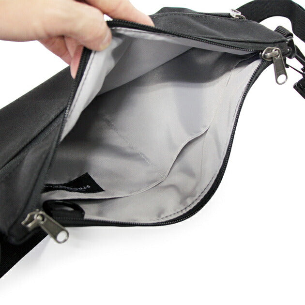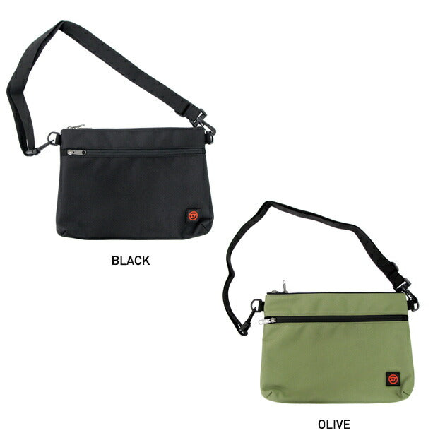 フロントに大型ポケットをあしらったサコッシュタイプのショルダーバッグ。もともと自転車のロードレースに使われる簡易バッグ「サコッシュ」をモチーフに、ファブリック防水生地でデザインしました。ハイキングや自転車のチョイ乗り、旅行先での散策用サブバッグとして、小物や手帳などを収納するバッグインバッグとしてなど、幅広い目的でお使いいただけるのはシンプルだからこそ。ファスナー付きの大きめのフロントポケットは、チケットやガイドマップなど、サッと出し入れしたいものを入れるのに役立ちます。メインポケットはボトム部分に少しマチをつけてますので、多少厚みのある物でも収容しやすく、ボディーにフィットします。内側にはポケットが2つとDカンを装備。鍵やスマートフォンなどの小物の収納が想定した作りになっています。