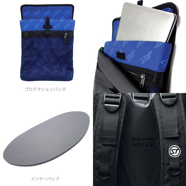 夜間使用時の為のリフレクターテープは前面と側面の2箇所に装備され、安全性を更に高めました。バッグ本体の防水性は維持しつつ、濡れたものを入れるのに便利なメッシュポケットを外部に装備しました。インナーには、ノートパソコンを収納できるプロテクションバッグが装備されています。着脱が簡単に行えますので空港などのセキュリティーポイントでも、パソコンだけを簡単に取りだすことができます。また、ボトムパッドは底部からのショックを和らげるとともに型崩れを防ぎます。