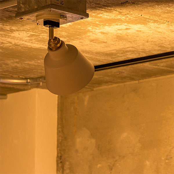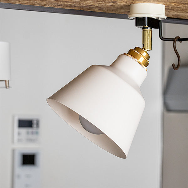 スポットライトタイプのシーリングライトです。角度調節ができて、存在感のある照明。取り付けるだけで空間の雰囲気が変わります。真鍮製のソケットカバーにマットなスチールシェードの組み合わせ。バランスの取れたシンプルなデザイン。シェードの内側はホワイト塗装なので、光を効率よく反射させ明るさを補います。カラーはブラック・ブラック、ブラック・ホワイト、ブラス・ブラック、ブラス・ホワイトの4色展開。インテリアのテイストに合わせて選んでください。※電球は別売りです。