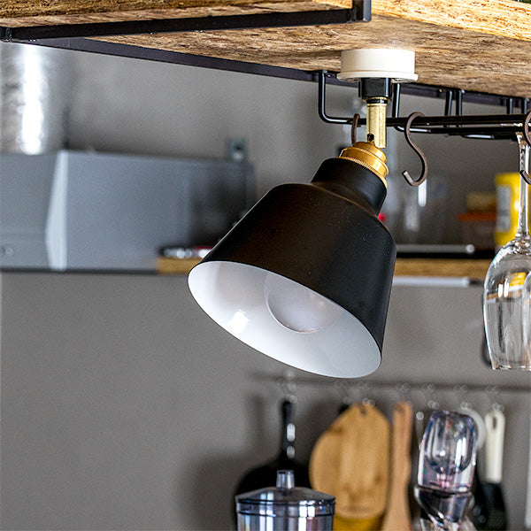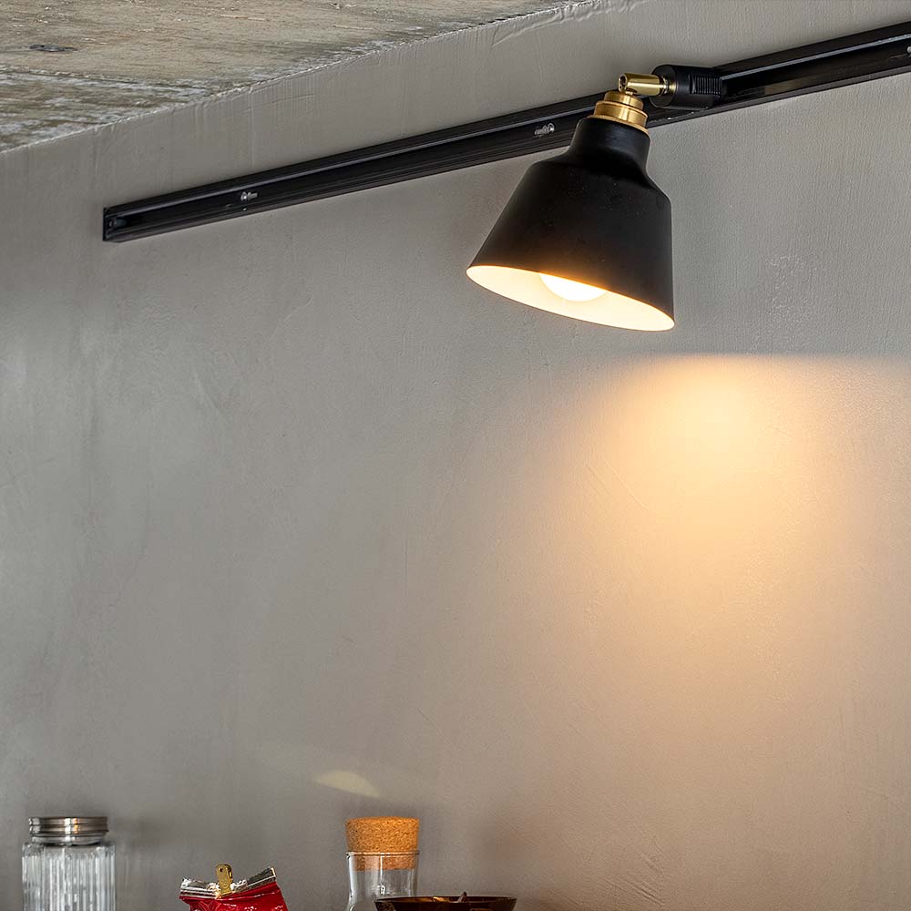 スポットライトタイプのシーリングライトです。角度調節ができて、存在感のある照明。取り付けるだけで空間の雰囲気が変わります。真鍮製のソケットカバーにマットなスチールシェードの組み合わせ。バランスの取れたシンプルなデザイン。シェードの内側はホワイト塗装なので、光を効率よく反射させ明るさを補います。カラーはブラック・ブラック、ブラック・ホワイト、ブラス・ブラック、ブラス・ホワイトの4色展開。インテリアのテイストに合わせて選んでください。