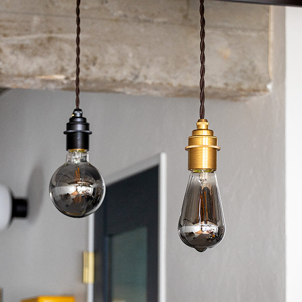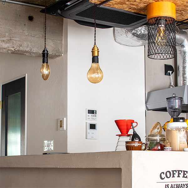 電球をディスプレイするためのシンプルなペンダントライトです。レトロな雰囲気が人気の「エジソン電球(カーボン電球)」。ガラスの形状はいくつかあり、独特なフォルムでインテリアにこだわる人たちを魅了する電球。そんなエジソン電球の魅力を最大限に活かせるシンプルな1灯ペンダントライト。ソケットを覆うカバーは真鍮製。エジソン電球のレトロな雰囲気と相性抜群。天井に取り付けてしまえば、あまりわからないところですが細部にこだわりました。取り付ける電球によって見た目の印象が変わります。玄関、廊下、トイレなどのスペースにぴったり。裸電球がレトロな雰囲気を醸し出します。※電球は別売りです。