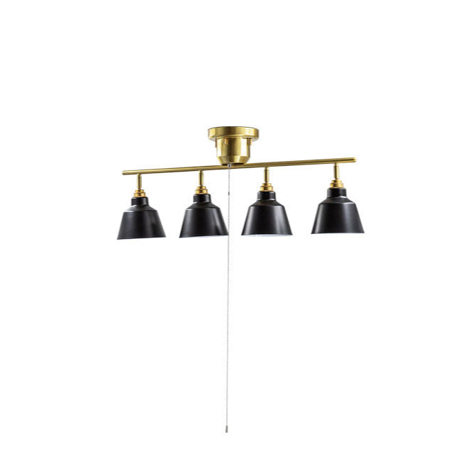 シンプルでありながらクラシカルなフォルムが特徴的なスポットライトです。シェードは少し大ぶりで存在感があります。4つのスポットライトはそれぞれが独立して角度調節できます。真鍮製のソケットカバーにマットなスチールシェードの組み合わせ。バランスの取れたシンプルなデザイン。シェードの内側はホワイト塗装なので、光を効率よく反射させ明るさを補います。カラーはブラック・ブラック、ブラック・ホワイト、ブラス・ブラック、ブラス・ホワイトの4色展開。インテリアのテイストに合わせて選んでください。口金E26の電球を4つ取り付けられます。810ルーメンのLED電球を取り付ければ約6~8畳、1520ルーメンのLED電球なら12畳前後の広さを照らすのに適しています。リビングやダイニングのメイン照明におすすめ。シェードは電球を覆うカタチで天井側には光は漏れません。灯りは一方向に集中します。本体から伸びているプルスイッチを引っ張ると4灯→3灯→1灯→消灯の順に点灯切り替えできます。