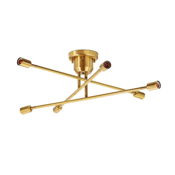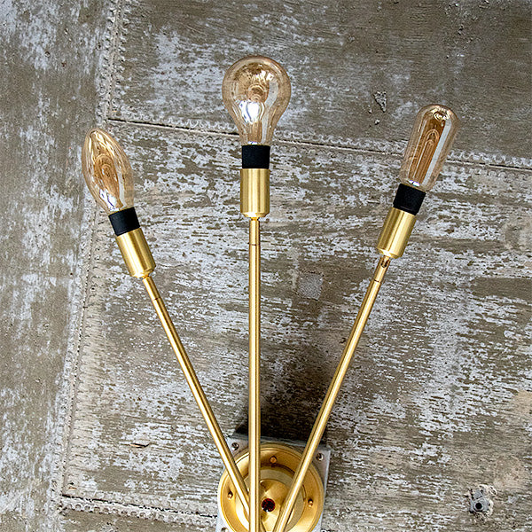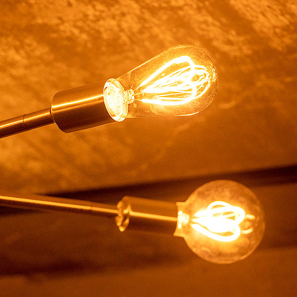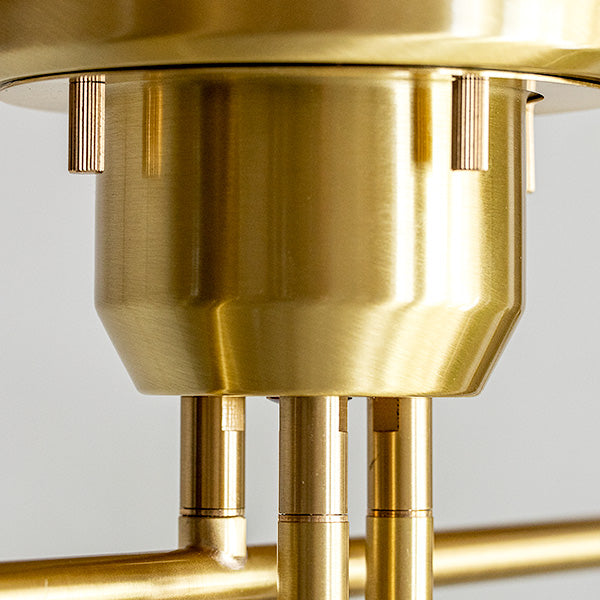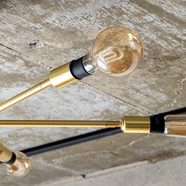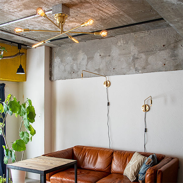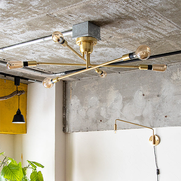 リモコン付きで快適操作。スタイリッシュでおしゃれな6灯シーリングライト。 細く伸びた3本のアームが交差するような個性的なデザイン。マットなボディがスタイリッシュな印象。おしゃれな電球をディスプレイするために、装飾を省いたシンプル設計。照明にこだわりたい方や、ありきたりなデザインに抵抗がある方におすすめしたいシーリングライトです。 ブラスは安価なゴールドメッキではなく、シーリングカバー、アーム、ソケットカバーまで贅沢に真鍮を使っています。 落ち着いた色味で嫌味がなくインテリアに合わせやすいカラーです。天井に取り付けるだけで部屋の雰囲気がゴージャスになり運気が良くなりそうな気がするそんなアイテムです。 アームを回転させることでカタチを変えられます。この照明を取り付けるだけで部屋の雰囲気はよくなり、遊びに来た友達にはおしゃれな部屋という印象を与えられるはず。 赤外線のリモコンが付いているのでわざわざスイッチまで行ってON・OFFをする必要はありません。また本体の高さは25.4センチと薄く、アームも細いので、低い天井に付けたときでもそこまで圧迫感を感じません。 光を遮る傘(シェード)がないため、少し暗めの電球でも明るく感じます。 ですので個人的には暗めの電球がおすすめ。デザイン性の高いLED電球やカーボン電球を組み合わせるとGood。もし明るさが足りない場合はテーブルライトやフロアライトなどの間接照明を使って補えばインテリアの上級者への第一歩。 明るいのがお好みでしたら、810ルーメン、1520ルーメンの電球を付ければ10畳から14畳ほどのスペースは十分に照らせます。