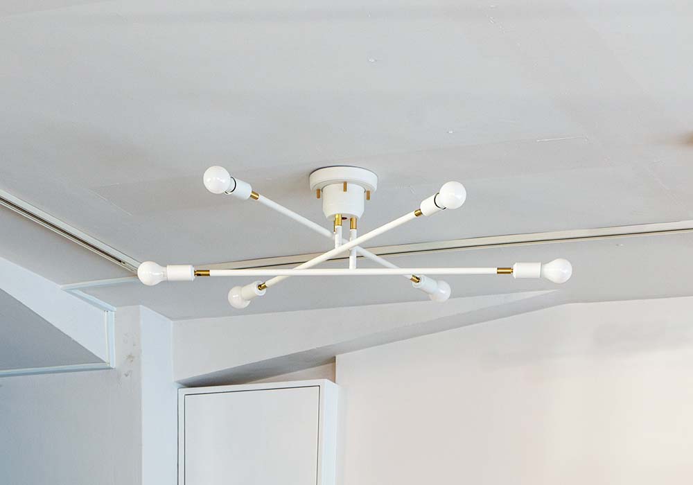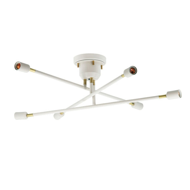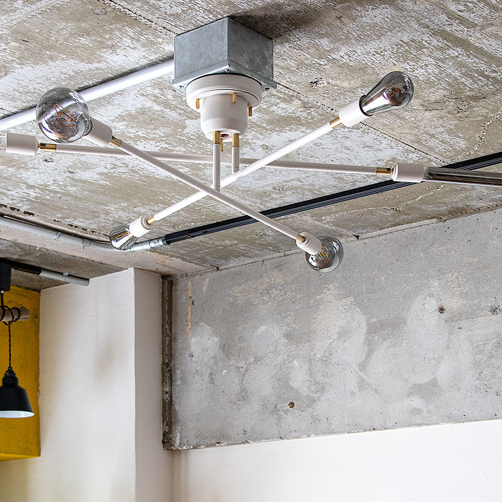 リモコン付きで快適操作。スタイリッシュでおしゃれな6灯シーリングライト。 細く伸びた3本のアームが交差するような個性的なデザイン。マットなボディがスタイリッシュな印象。おしゃれな電球をディスプレイするために、装飾を省いたシンプル設計。照明にこだわりたい方や、ありきたりなデザインに抵抗がある方におすすめしたいシーリングライトです。 ブラスは安価なゴールドメッキではなく、シーリングカバー、アーム、ソケットカバーまで贅沢に真鍮を使っています。 落ち着いた色味で嫌味がなくインテリアに合わせやすいカラーです。天井に取り付けるだけで部屋の雰囲気がゴージャスになり運気が良くなりそうな気がするそんなアイテムです。 アームを回転させることでカタチを変えられます。この照明を取り付けるだけで部屋の雰囲気はよくなり、遊びに来た友達にはおしゃれな部屋という印象を与えられるはず。 赤外線のリモコンが付いているのでわざわざスイッチまで行ってON・OFFをする必要はありません。また本体の高さは25.4センチと薄く、アームも細いので、低い天井に付けたときでもそこまで圧迫感を感じません。 光を遮る傘(シェード)がないため、少し暗めの電球でも明るく感じます。 ですので個人的には暗めの電球がおすすめ。デザイン性の高いLED電球やカーボン電球を組み合わせるとGood。もし明るさが足りない場合はテーブルライトやフロアライトなどの間接照明を使って補えばインテリアの上級者への第一歩。 明るいのがお好みでしたら、810ルーメン、1520ルーメンの電球を付ければ10畳から14畳ほどのスペースは十分に照らせます。